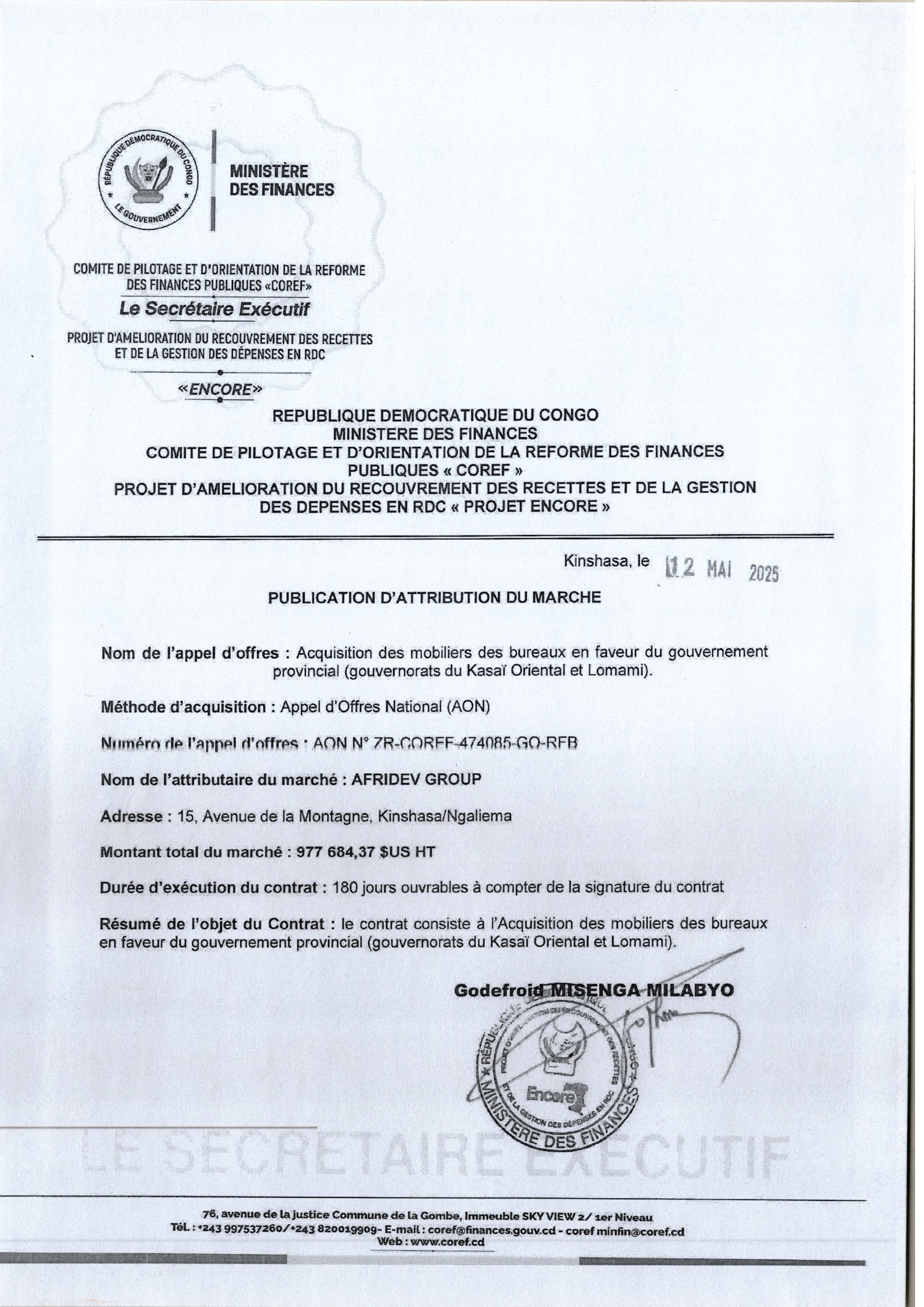 Décision d’attribution du marché accordée à AFRIDEV GROUP relative à l’acquisition des mobiliers des bureaux en faveur du gouvernement provincial (gouvernorats du Kasaï-Oriental et Lomami).