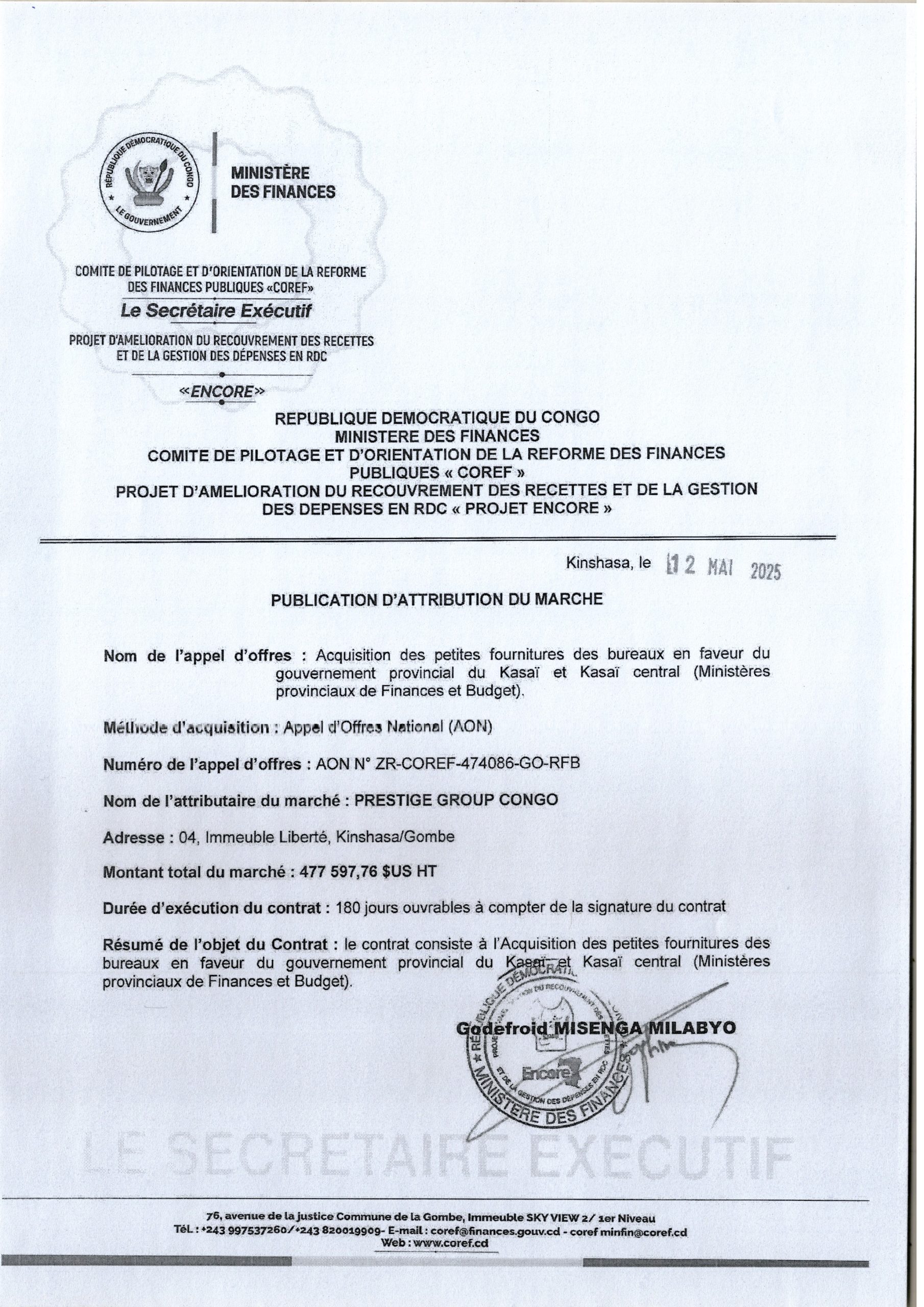 Décision d’attribution du marché accordée à PRESTIGE GROUP CONGO relative à l’acquisition des petites fournitures des bureaux en faveur du gouvernement provincial du Kasaï et Kasaï central (Ministère provinciaux de Finances et Budget).