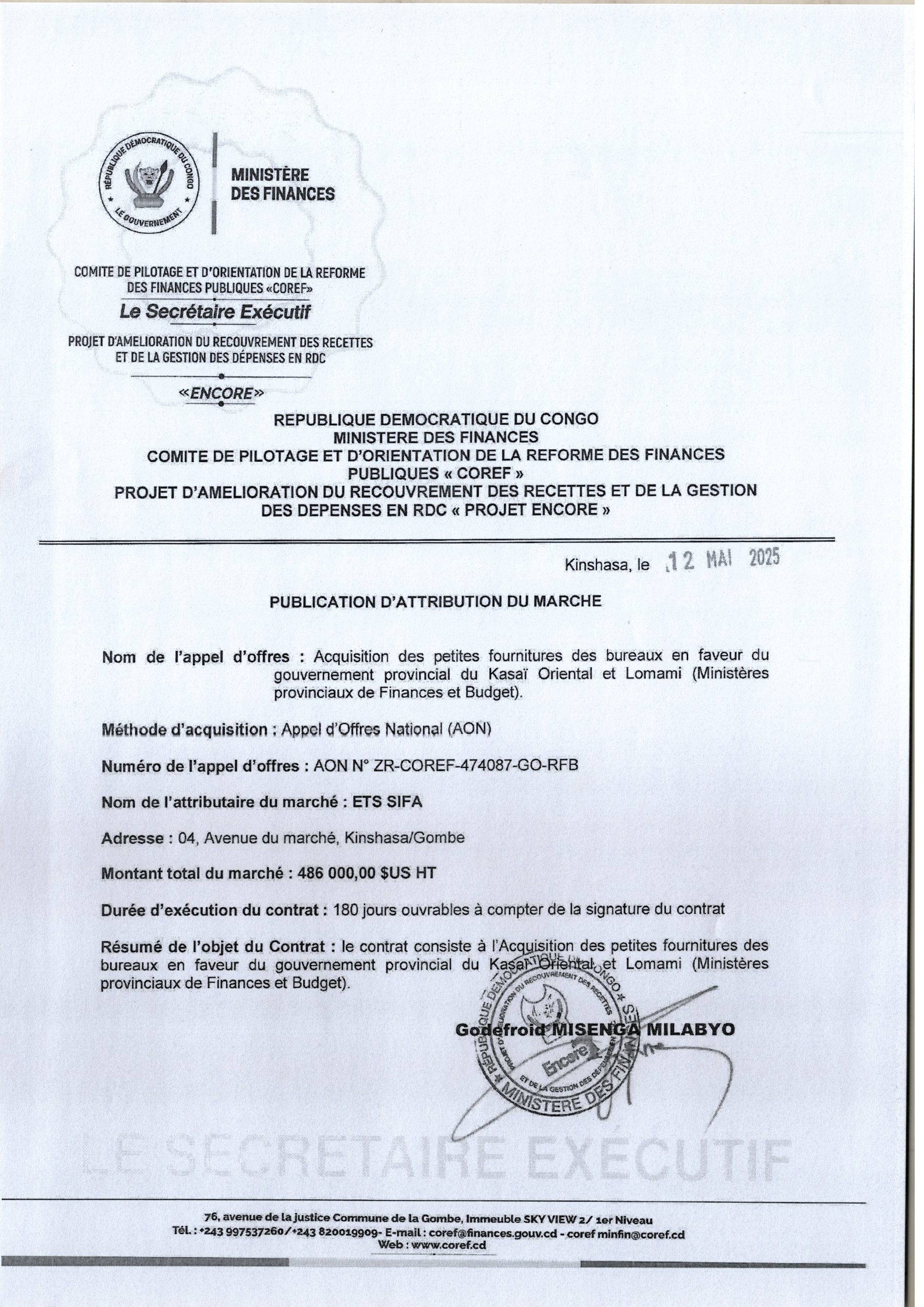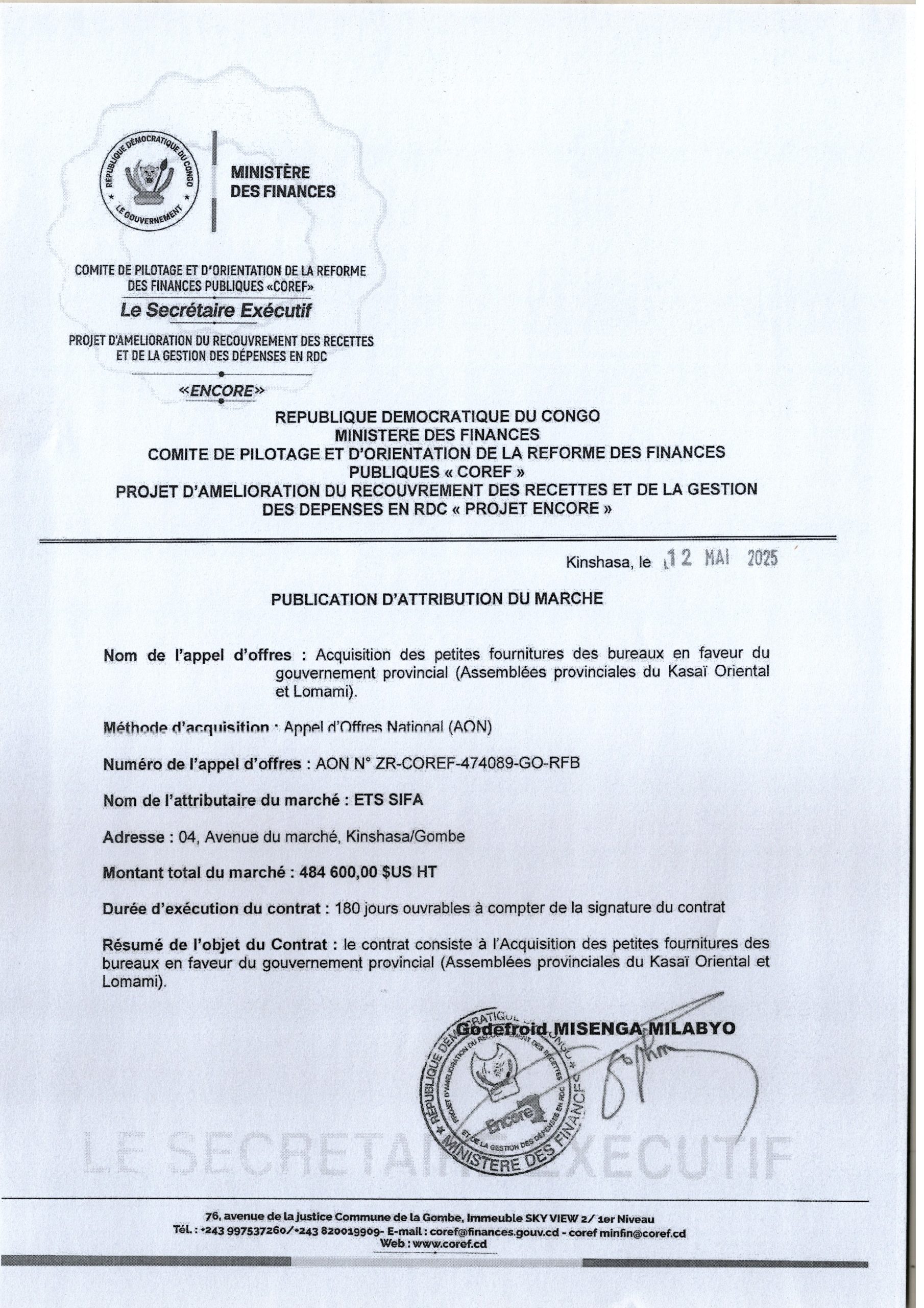 Décision d’attribution du marché accordée à ETS SIFA relative à l’acquisition des petites fournitures des bureaux en faveur du gouvernement provincial du Kasaï-Oriental et Lomami (Ministère provinciaux de Finances et Budget).