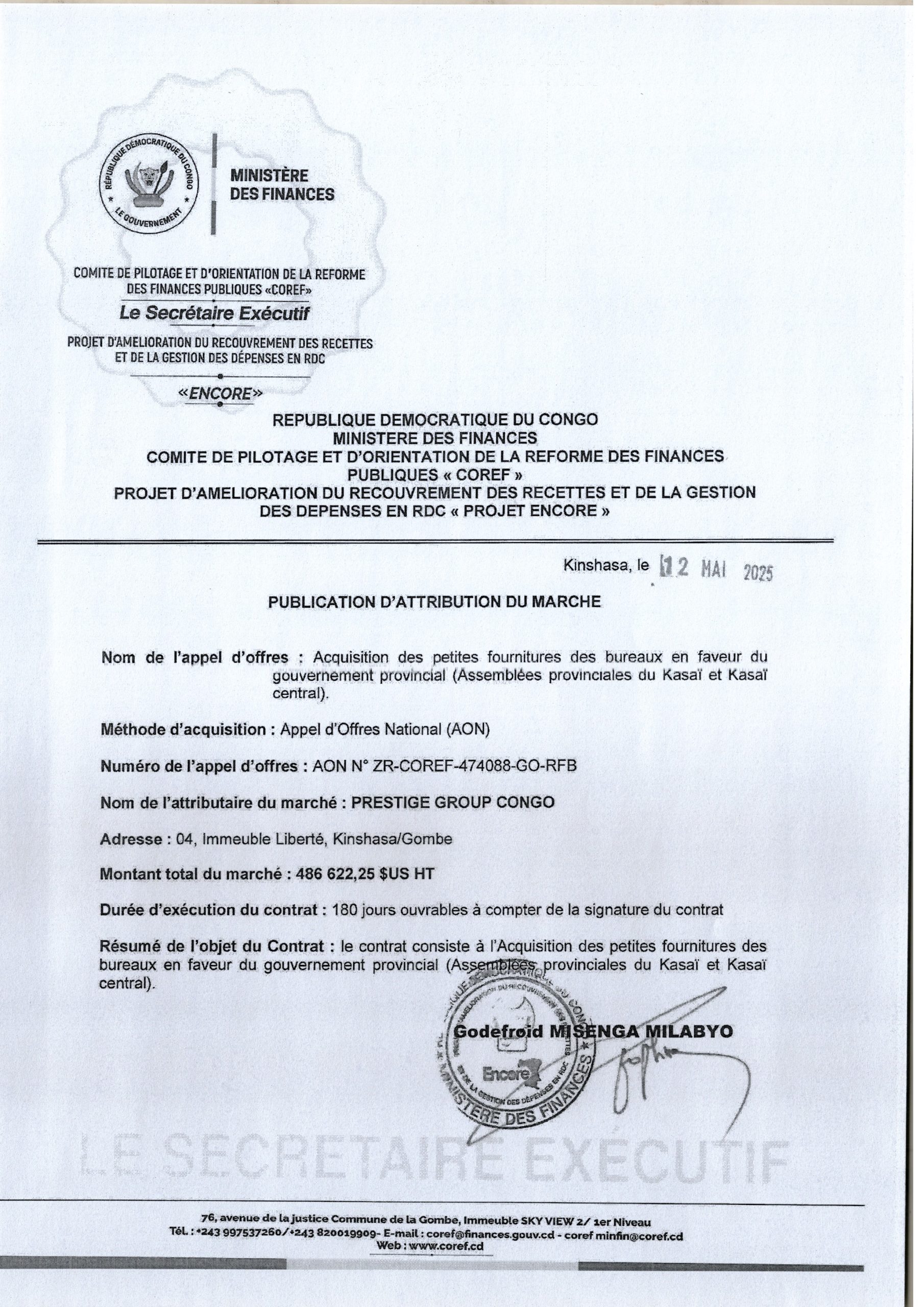 Décision d’attribution du marché accordée à PRESTIGE GROUP CONGO relative à l’acquisition des petites fournitures des bureaux en faveur du gouvernement provincial (Assemblées provinciales du Kasaï et Kasaï central).