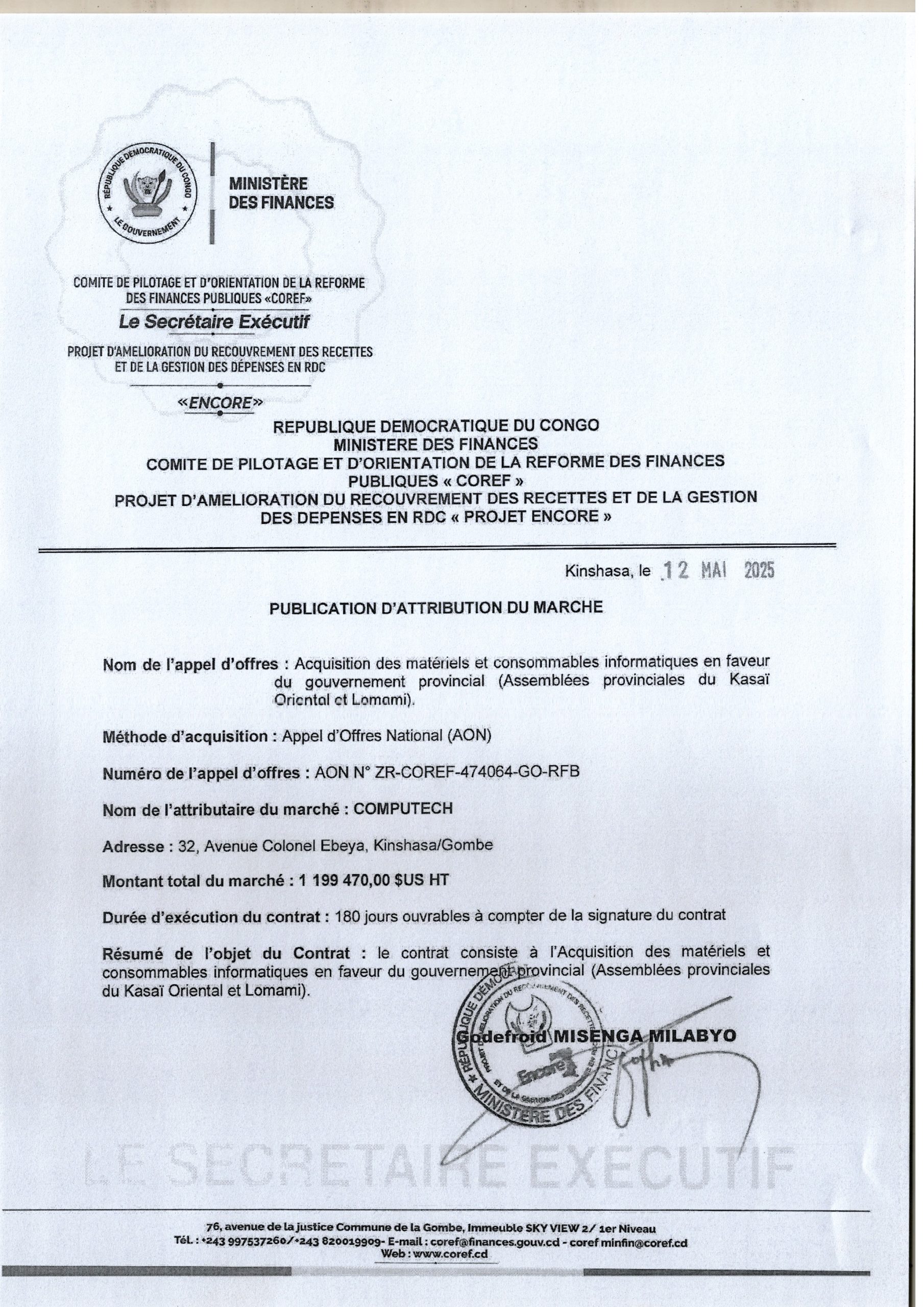 Attribution accordée à la société “COMPUTECH” le marché relatif à l’acquisition des matériels et consommables informatiques en faveur du gouvernement provincial ( Assemblées provinciales du Kasai Oriental et Lomami).