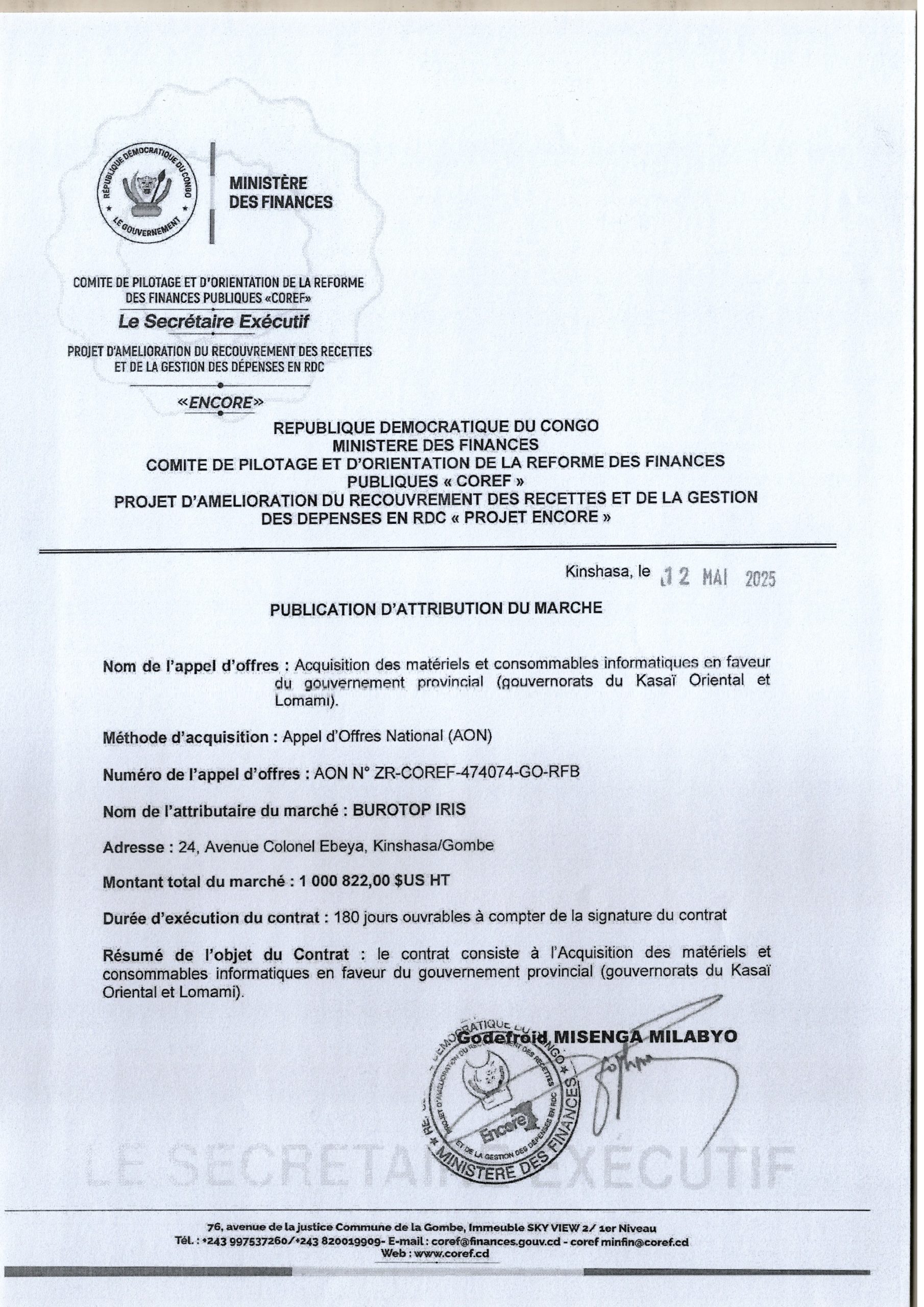 Attribution accordée à la société “BUROTOP IRIS” le marché relatif à l’acquisition des matériels et consommables informatiques en faveur du gouvernement provincial du Kasai Oriental et Lomami (Ministères provinciaux de Finances et Budget).
