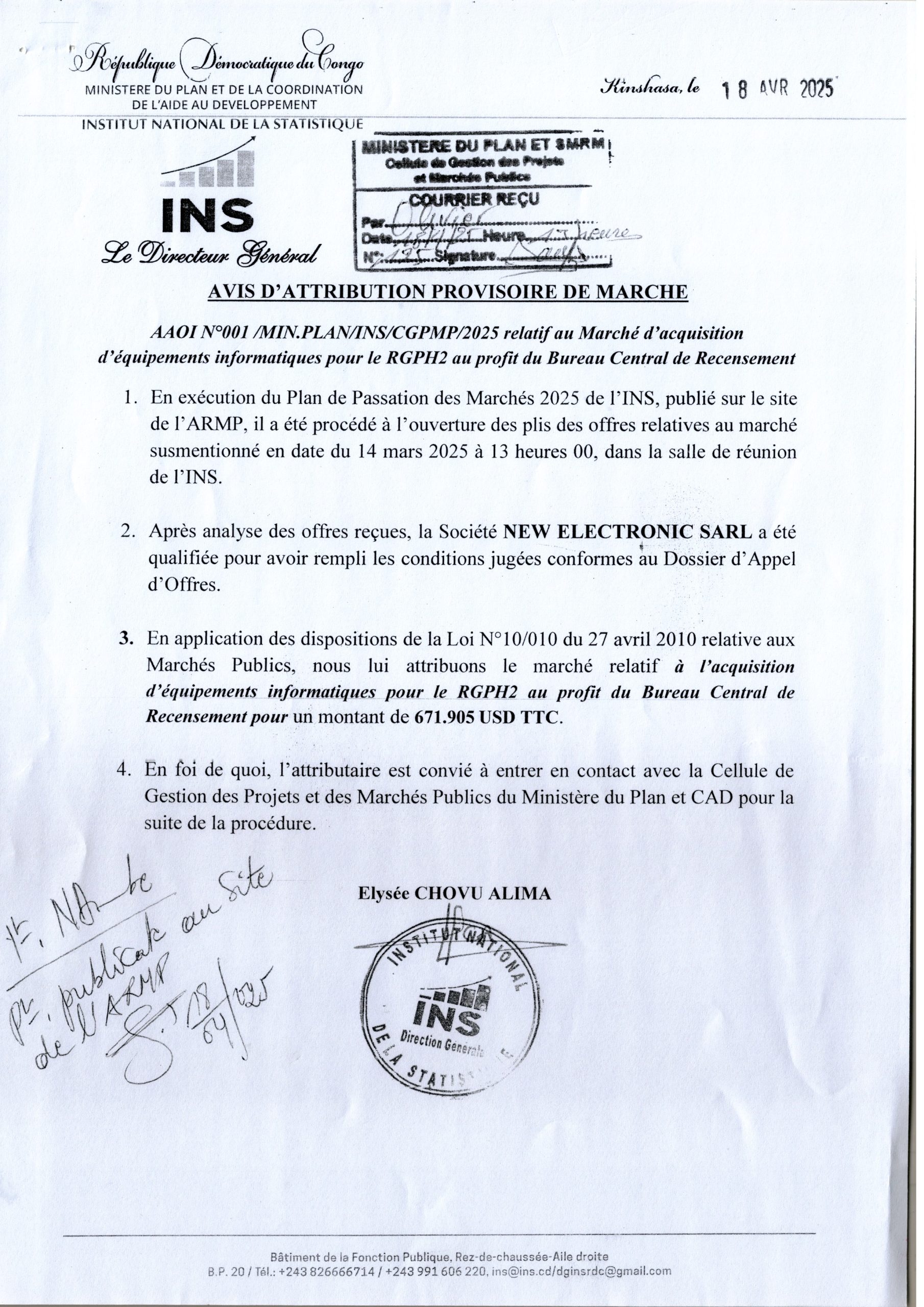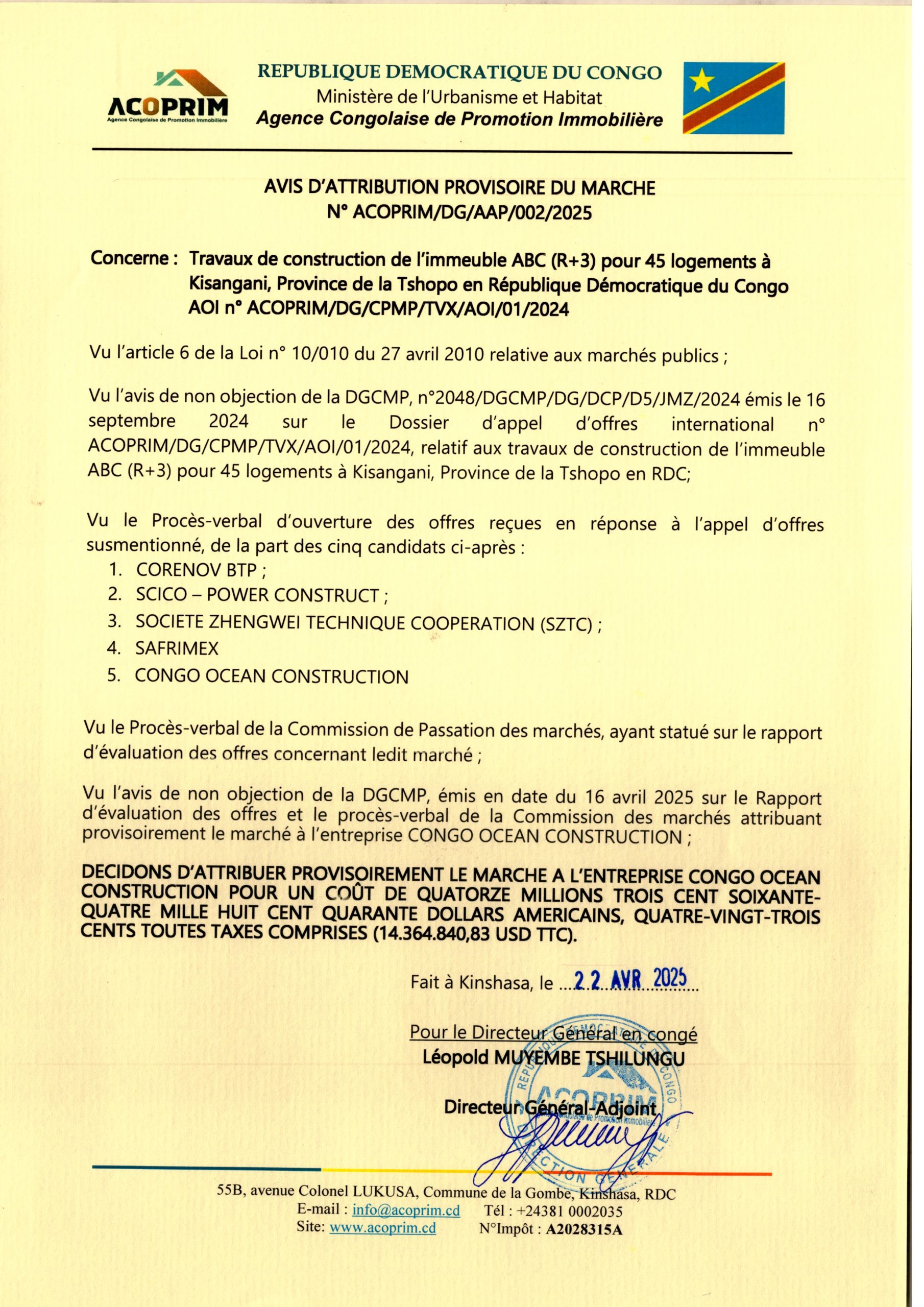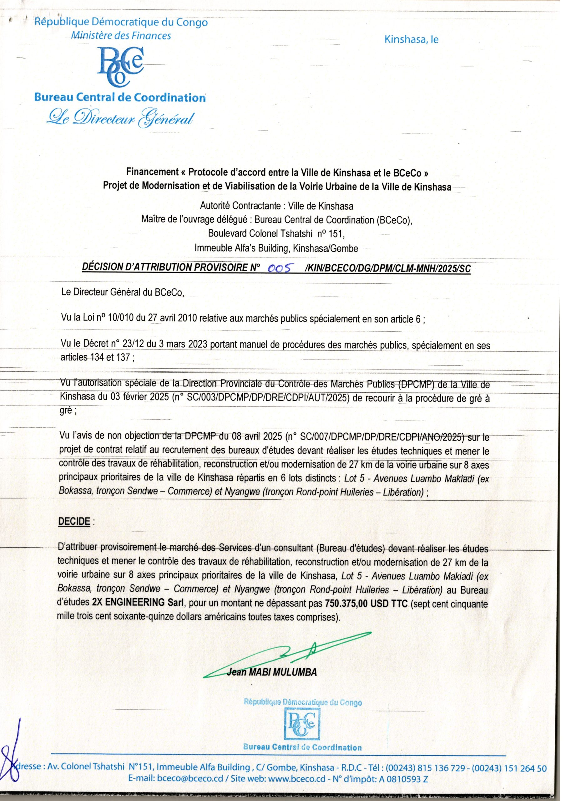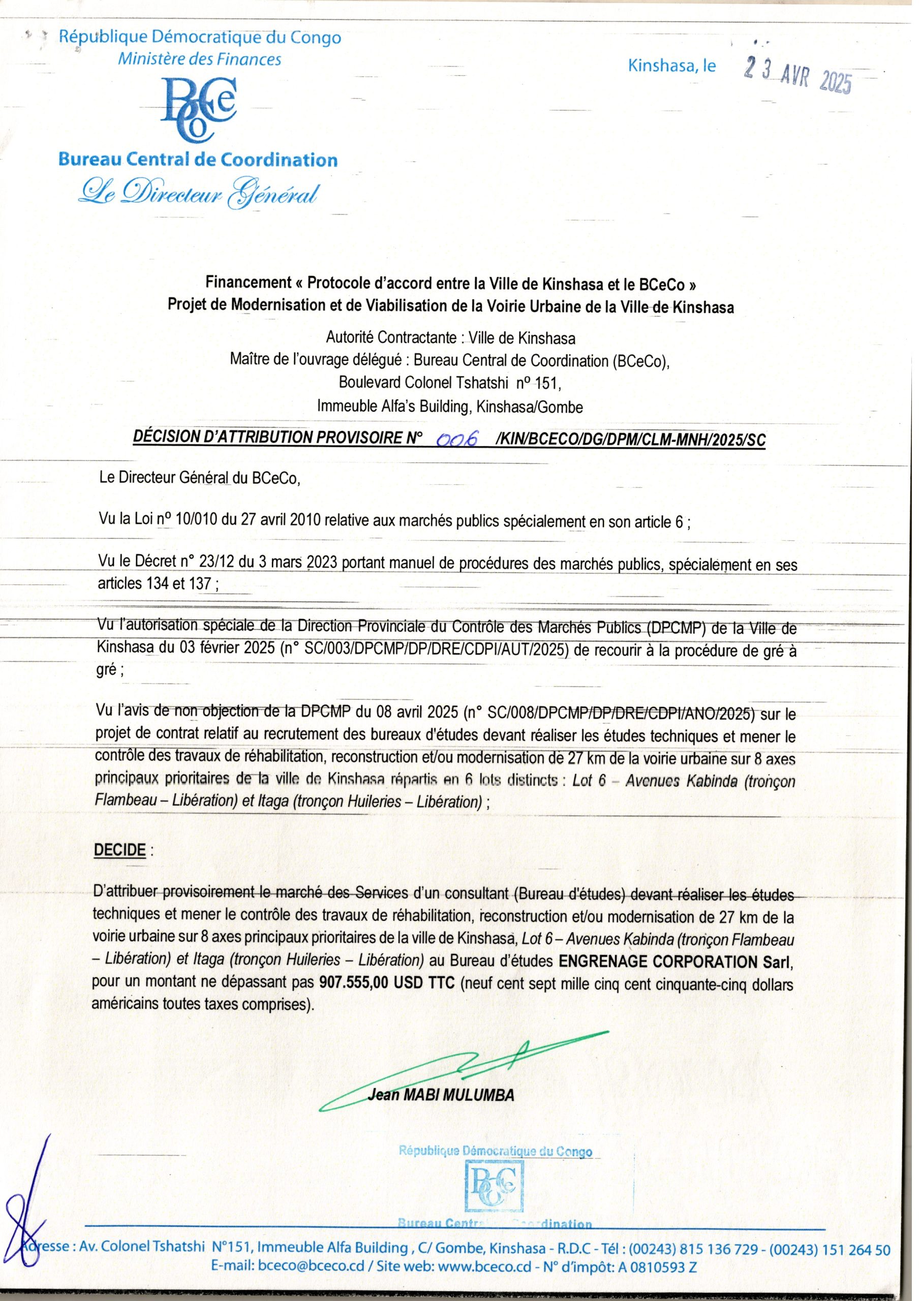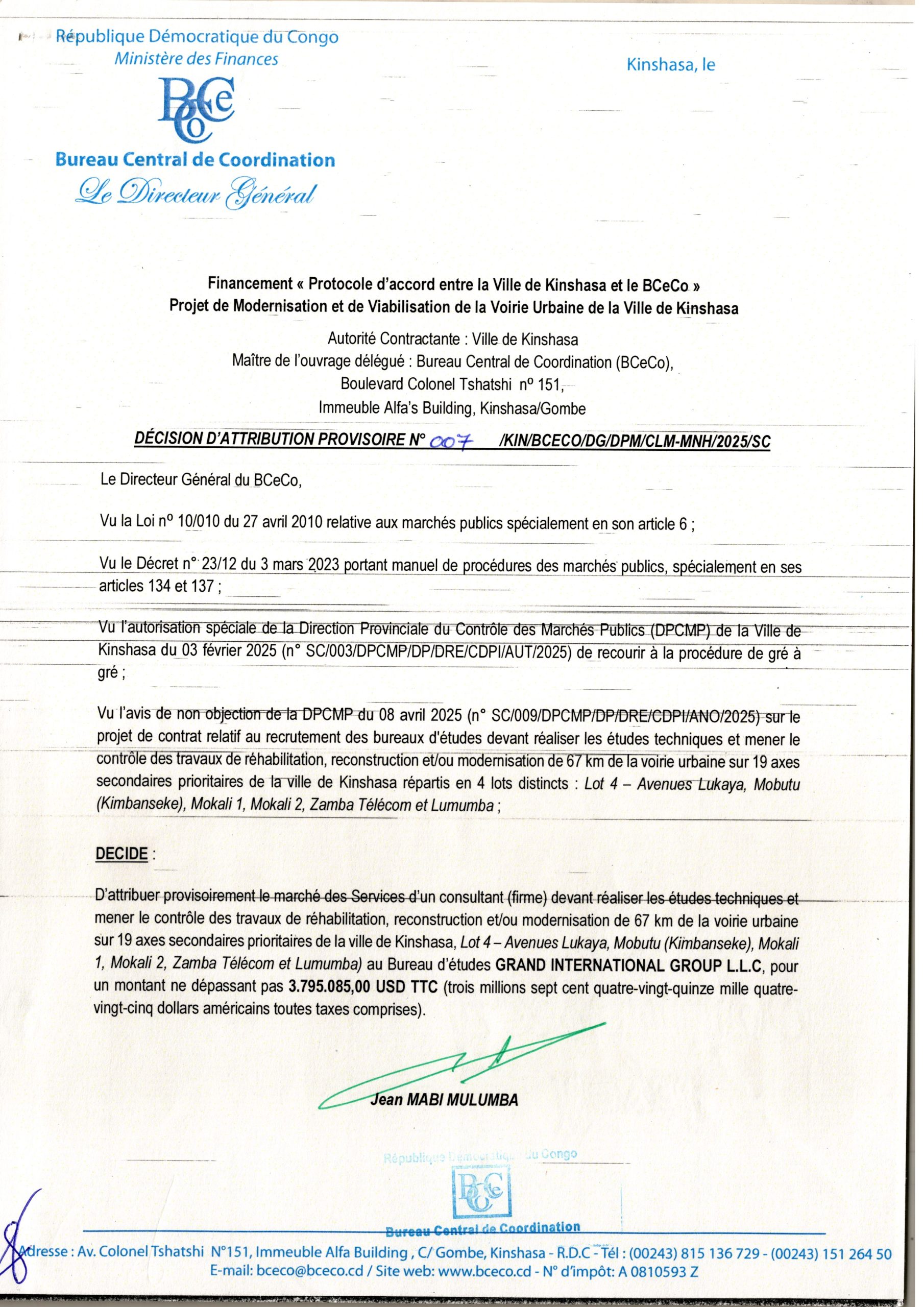 Attribution provisoire accordée au Bureau d’études GRAND INTERNATIONAL GROUP LLC relative au marché des services d’un consultant (firme) devant réaliser les études techniques et mener le contrôle des travaux de réhabilitation ,reconstruction et/ou modernisation de 67 km de la voirie urbaine sur 19 axes secondaires prioritaires de la ville de Kinshasa (lot 4).