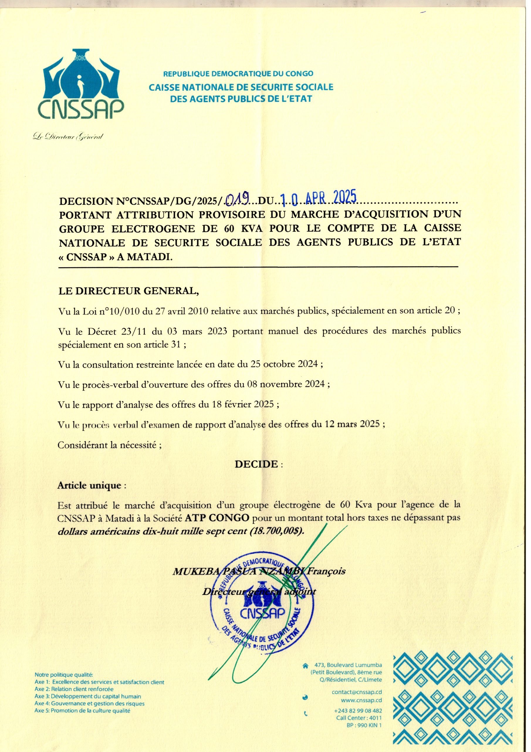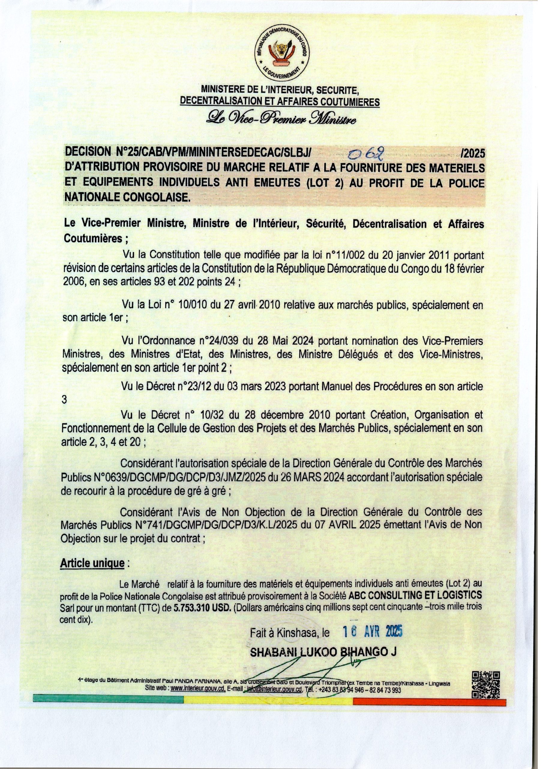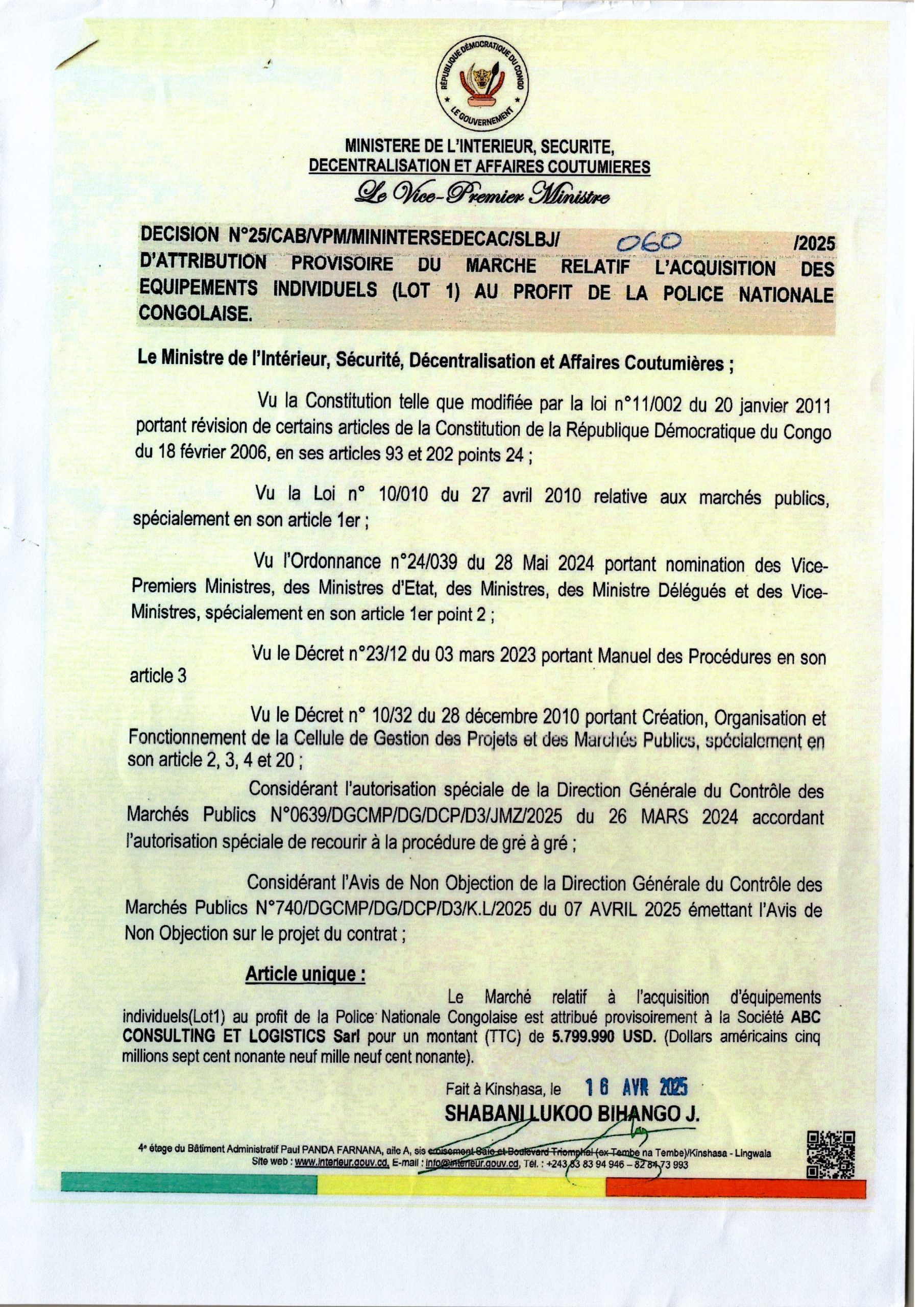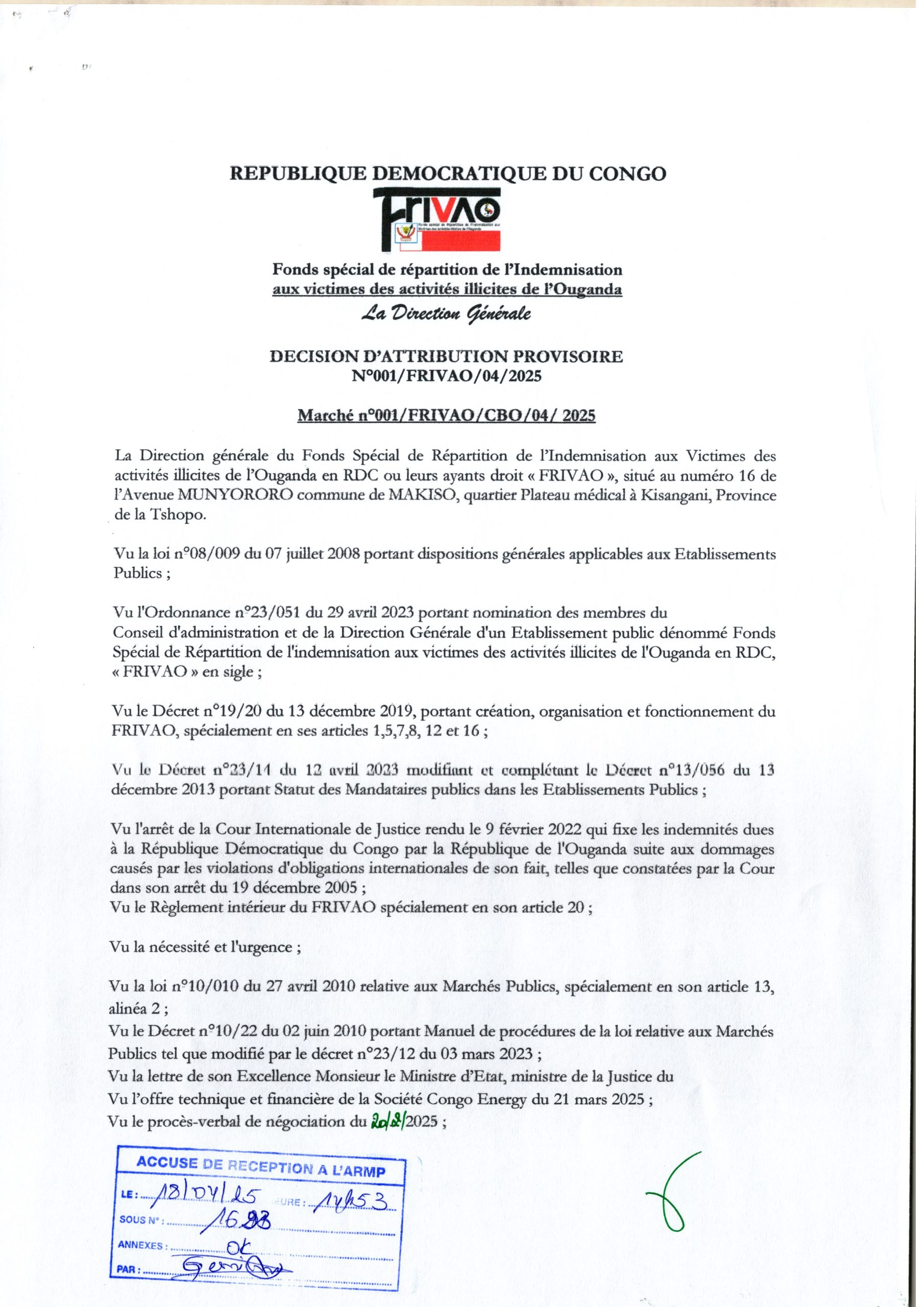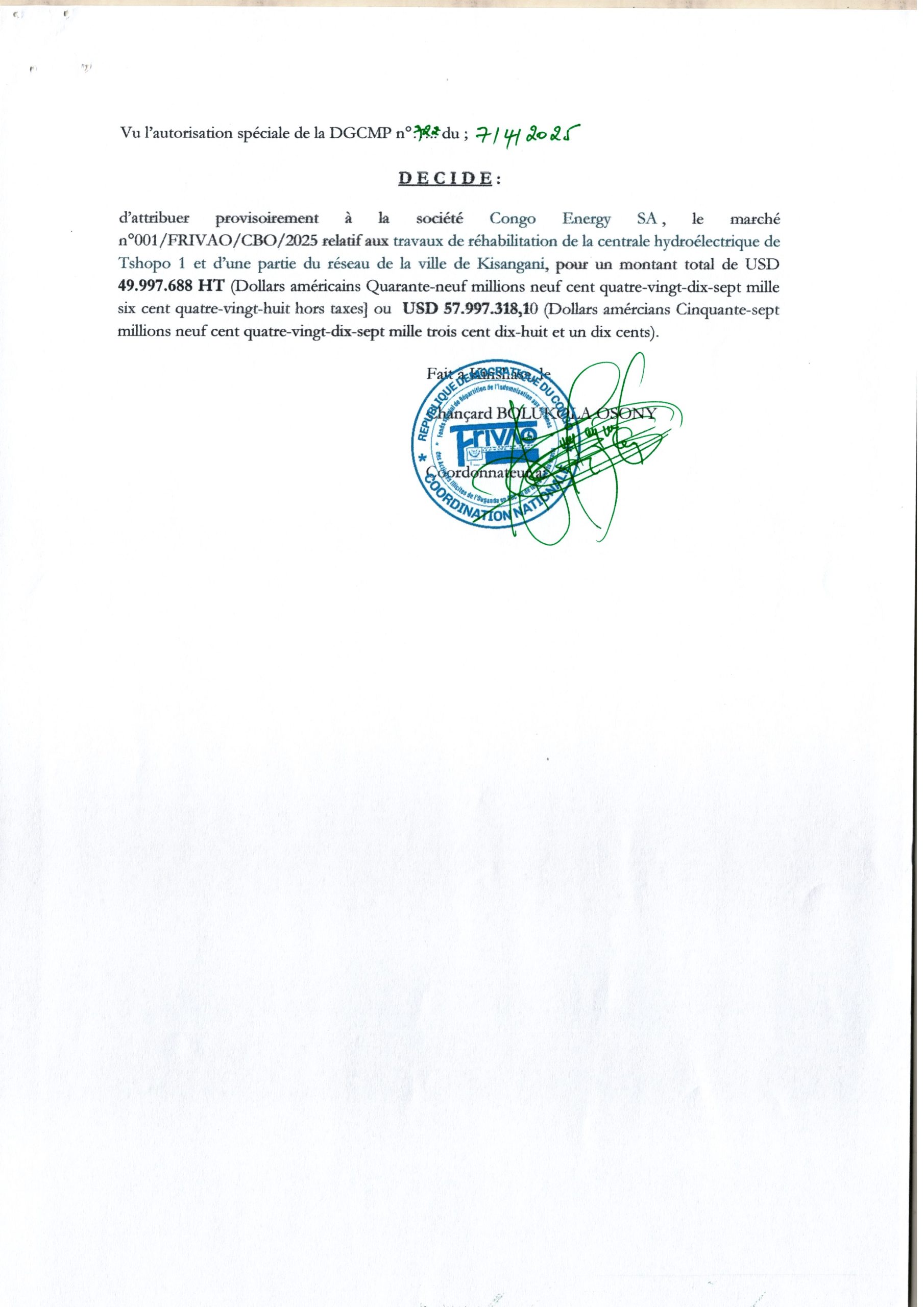 Attribution provisoire accordée au Bureau d’études GRAND INTERNATIONAL GROUP LLC relative au marché des services d’un consultant (firme) devant réaliser les études techniques et mener le contrôle des travaux de réhabilitation ,reconstruction et/ou modernisation de 67 km de la voirie urbaine sur 19 axes secondaires prioritaires de la ville de Kinshasa (lot 4).