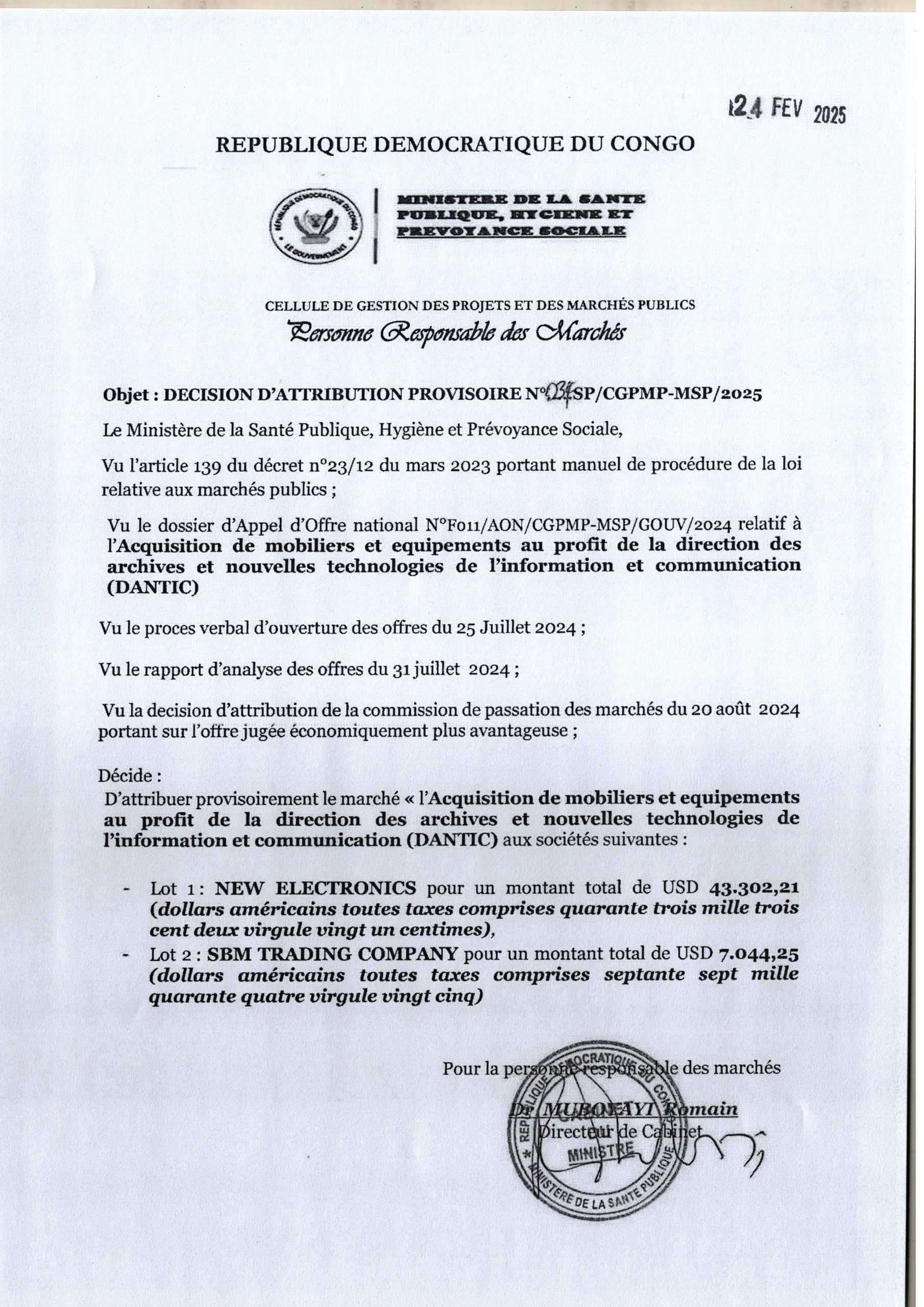 Attribution Provisoire du marché d’Acquisition de mobiliers et équipements au profit de la direction des archives et nouvelles technologies de l’Information et communication (DANTIC) : lot 1 à NEW ELECTRONICS et lot 2 SBM TRADING COMPANY