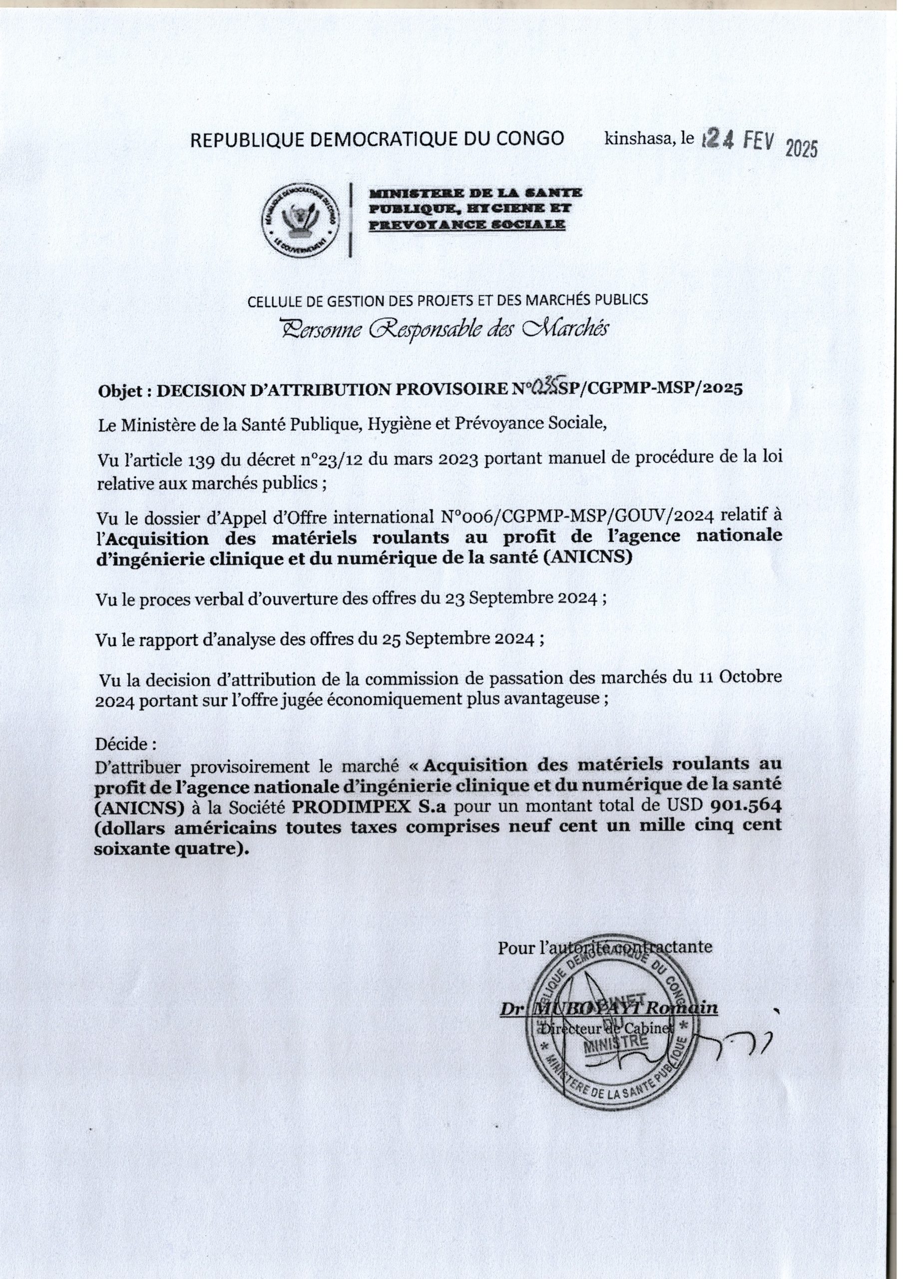 Attribution Provisoire du marché d’Acquisition des matériels roulants au profit de l’agence nationale d’ingénierie clinique et du numérique de la santé (ANICNCS) à la Société PRODIMPEX S.a