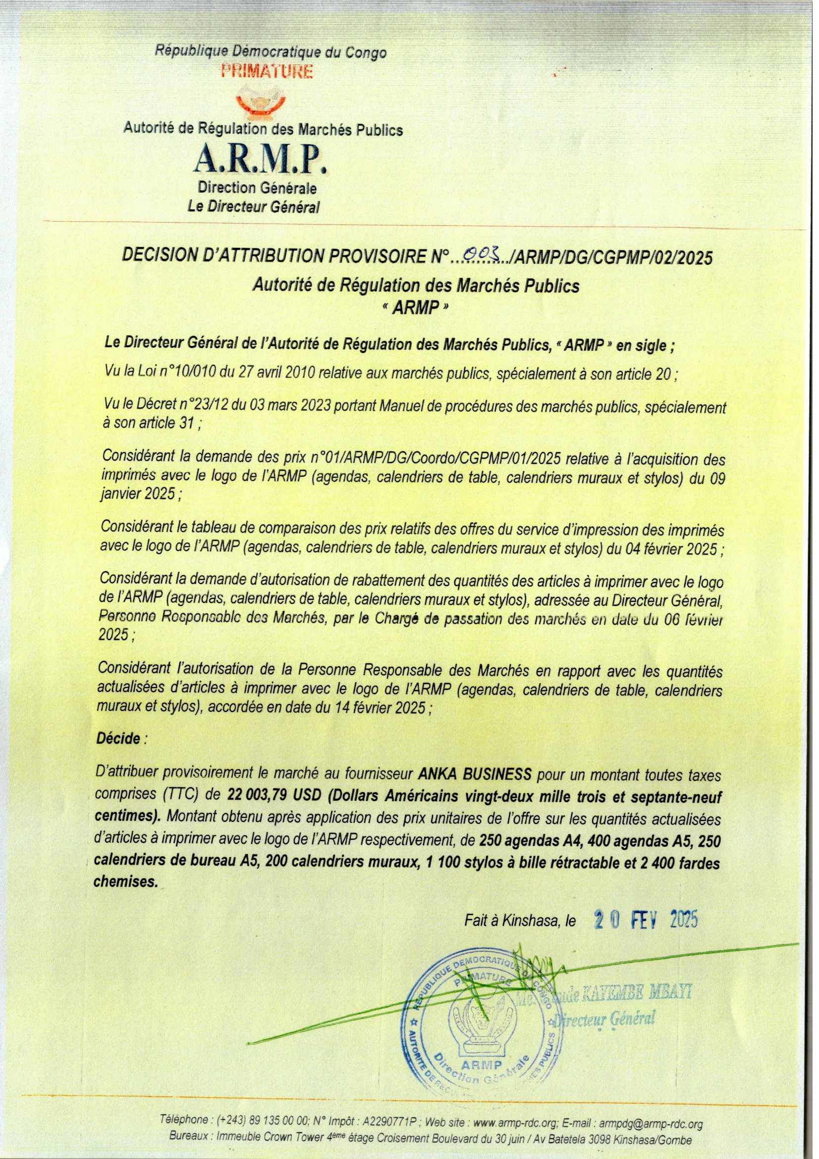 Attribution provisoire accordée au fournisseur ANKA BUSINESS relative à l’acquisition des imprimés avec logo de l’ARMP (agendas, calendriers de table, calendriers muraux et stylos).