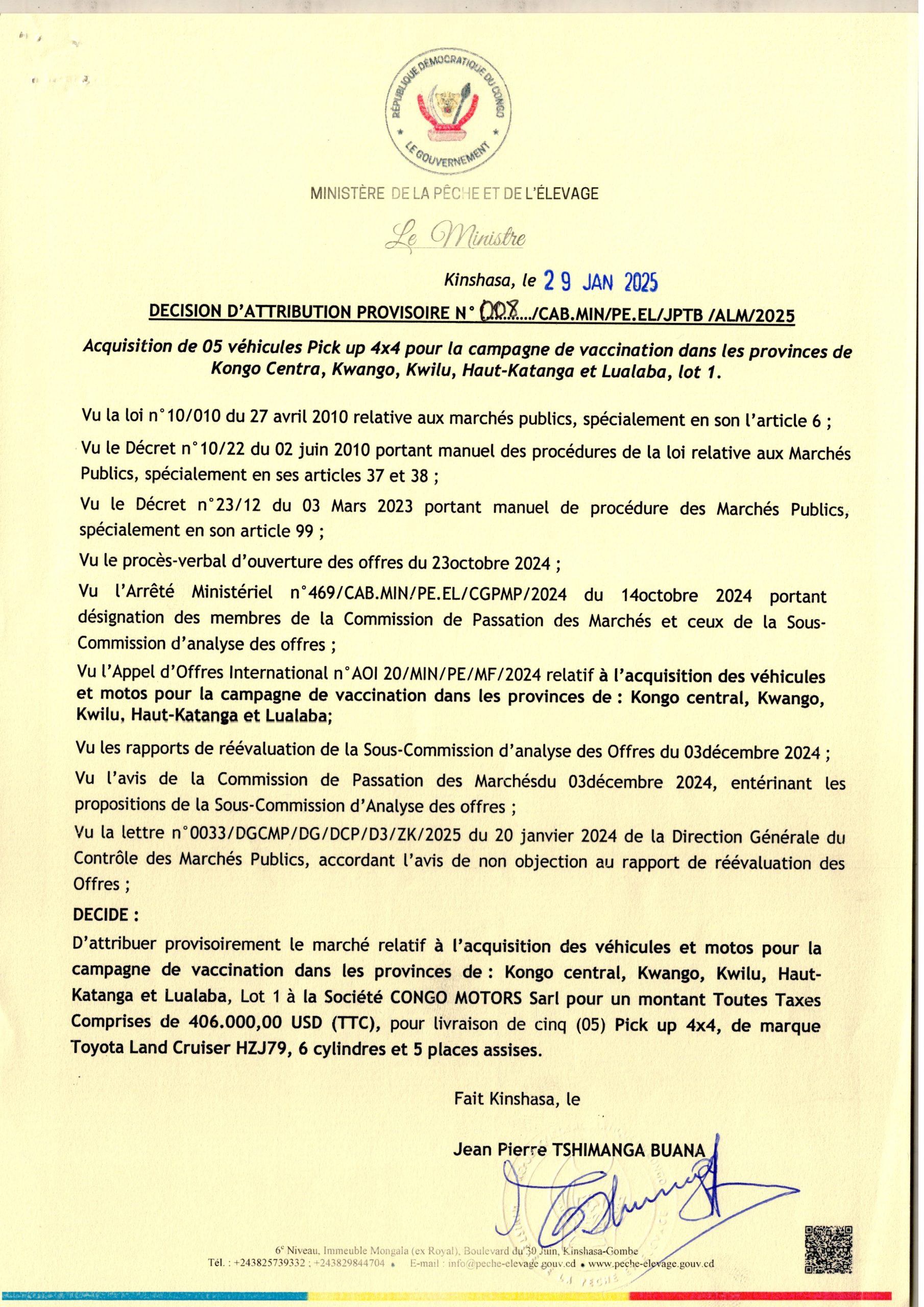 Attribution provisoire accordée à la société CONGO MOTORS relative à l’acquisition de 05 véhicules Pick up 4×4 pour la campagne de vaccination dans les provinces de Kongo Central, Kwango, Kwilu, Haut-Katanga et Lualaba, lot 1