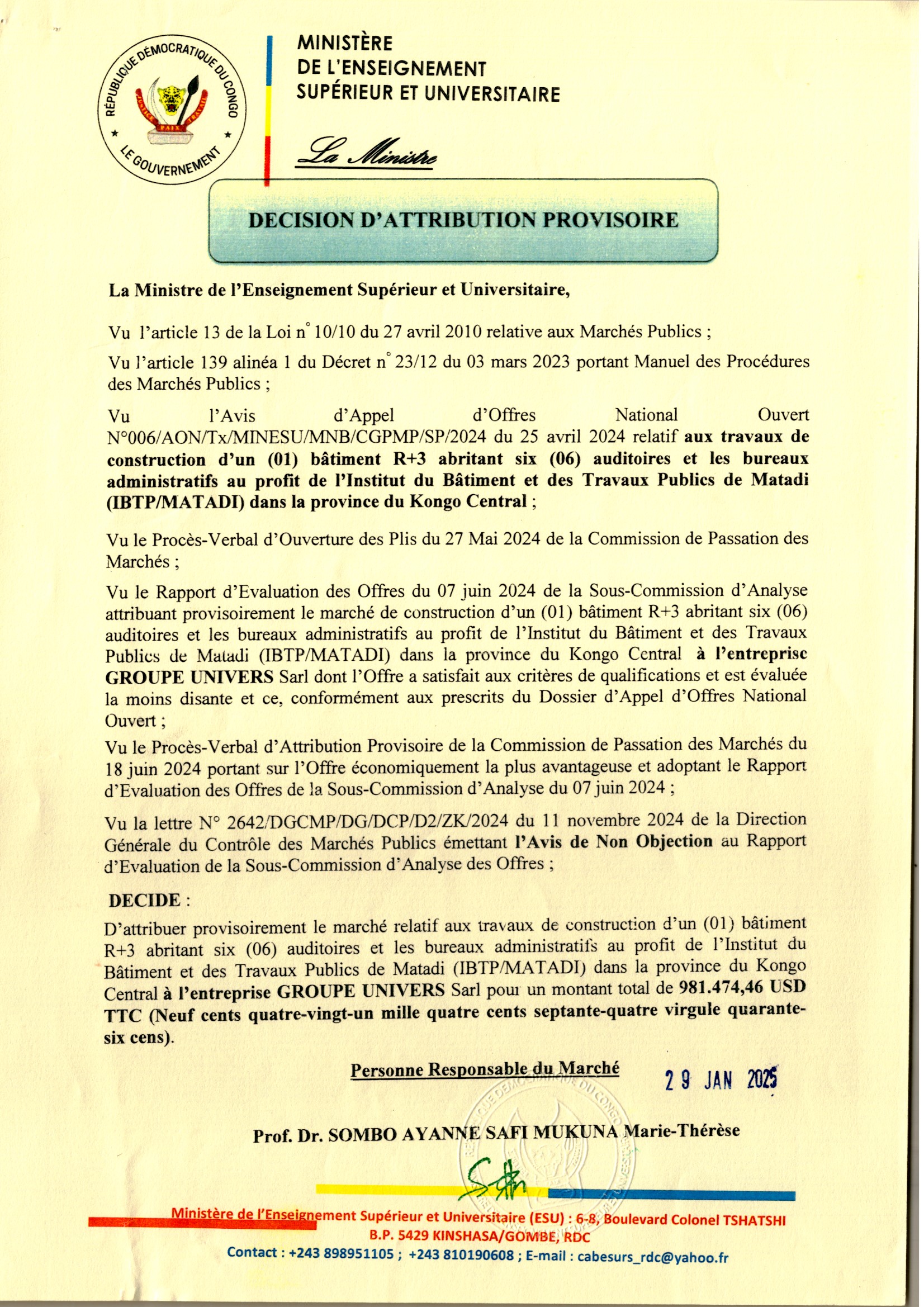 Décision d’attribution provisoire accordée à l’Entreprise GROUPE UNIVERS Sarl relative aux travaux de construction d’un (01)bâtiment R+3 abritant six (06) auditoires et les bureaux administratifs au profit de l’Institut du Bâtiment et des Travaux Publics de Matadi (IBTP/MATADI) dans la province du Kongo Central).