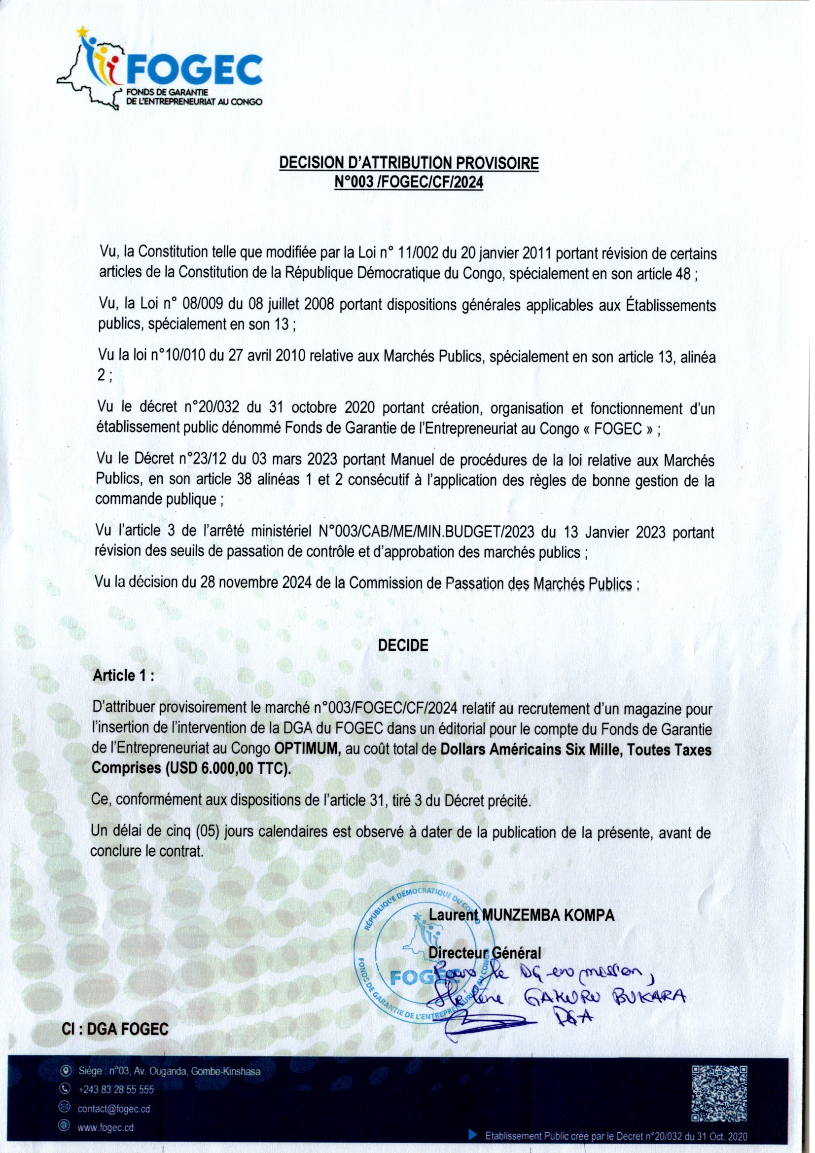 Décision d’attribution provisoire accordée à L’OPTIMUM relative au recrutement d’un magazine pour l’insertion de l’intervention de la DGA du FOGEC dans un éditorial pour le compte du Fonds de Garantie de l’Entrepreneuriat au Congo.