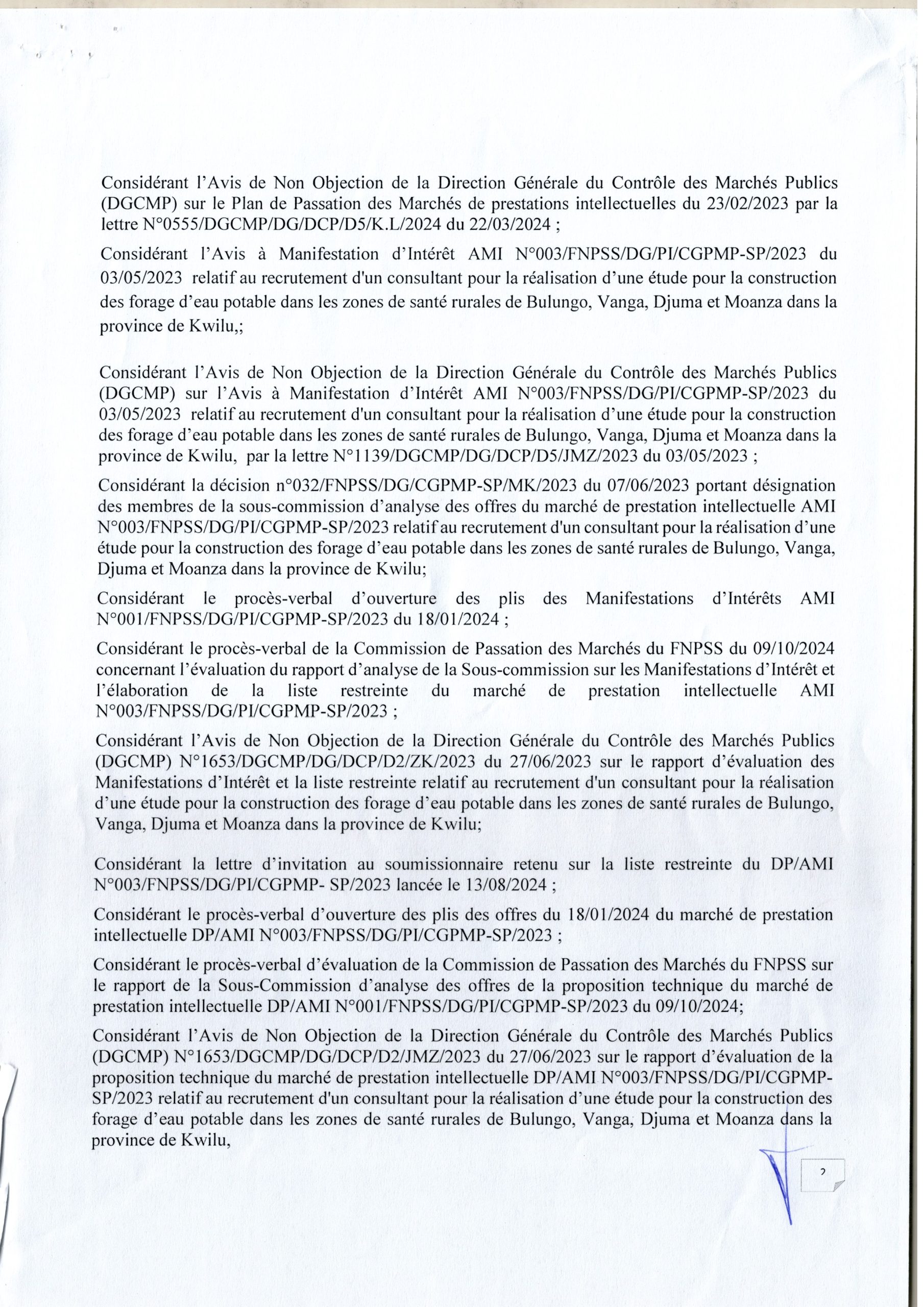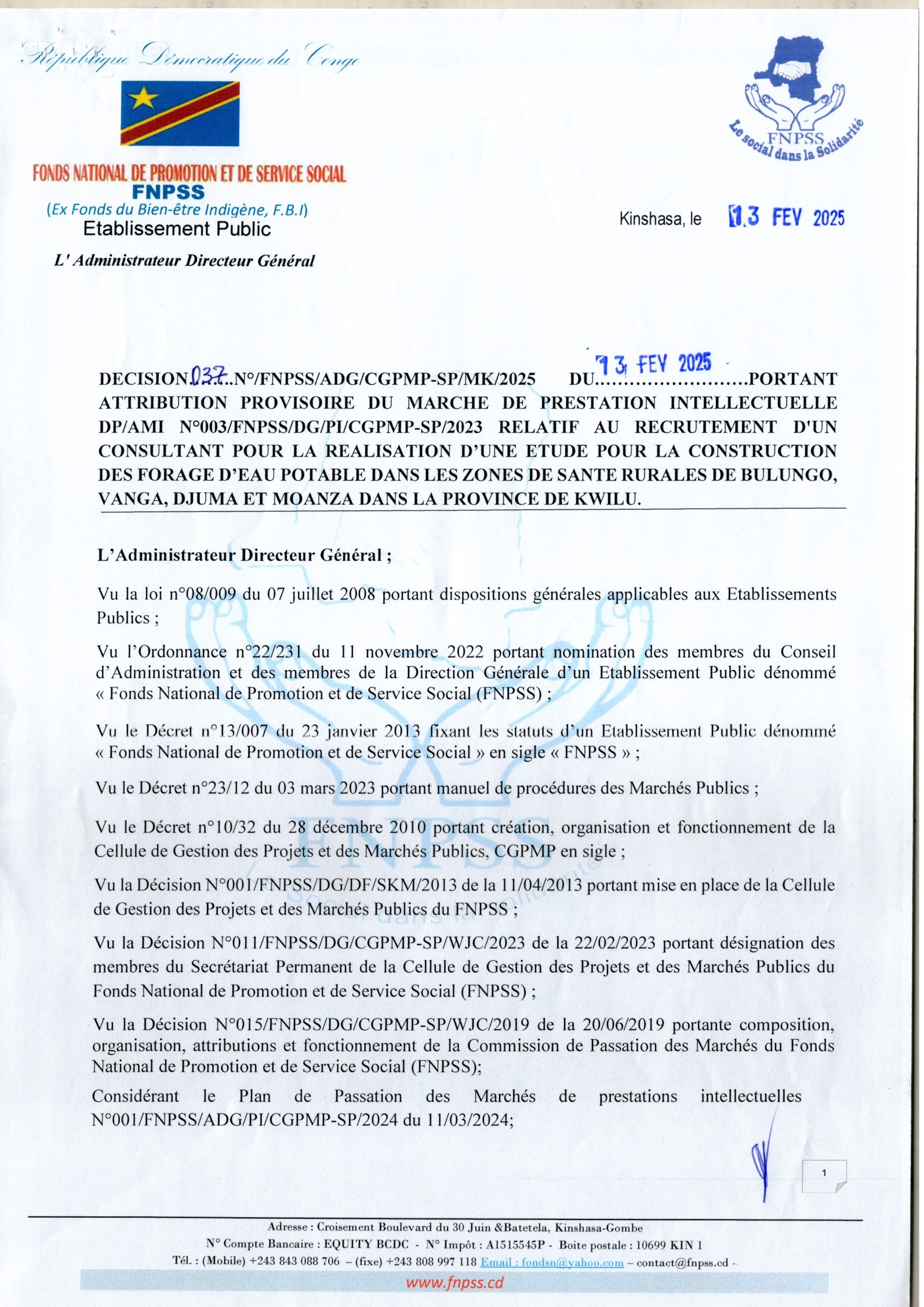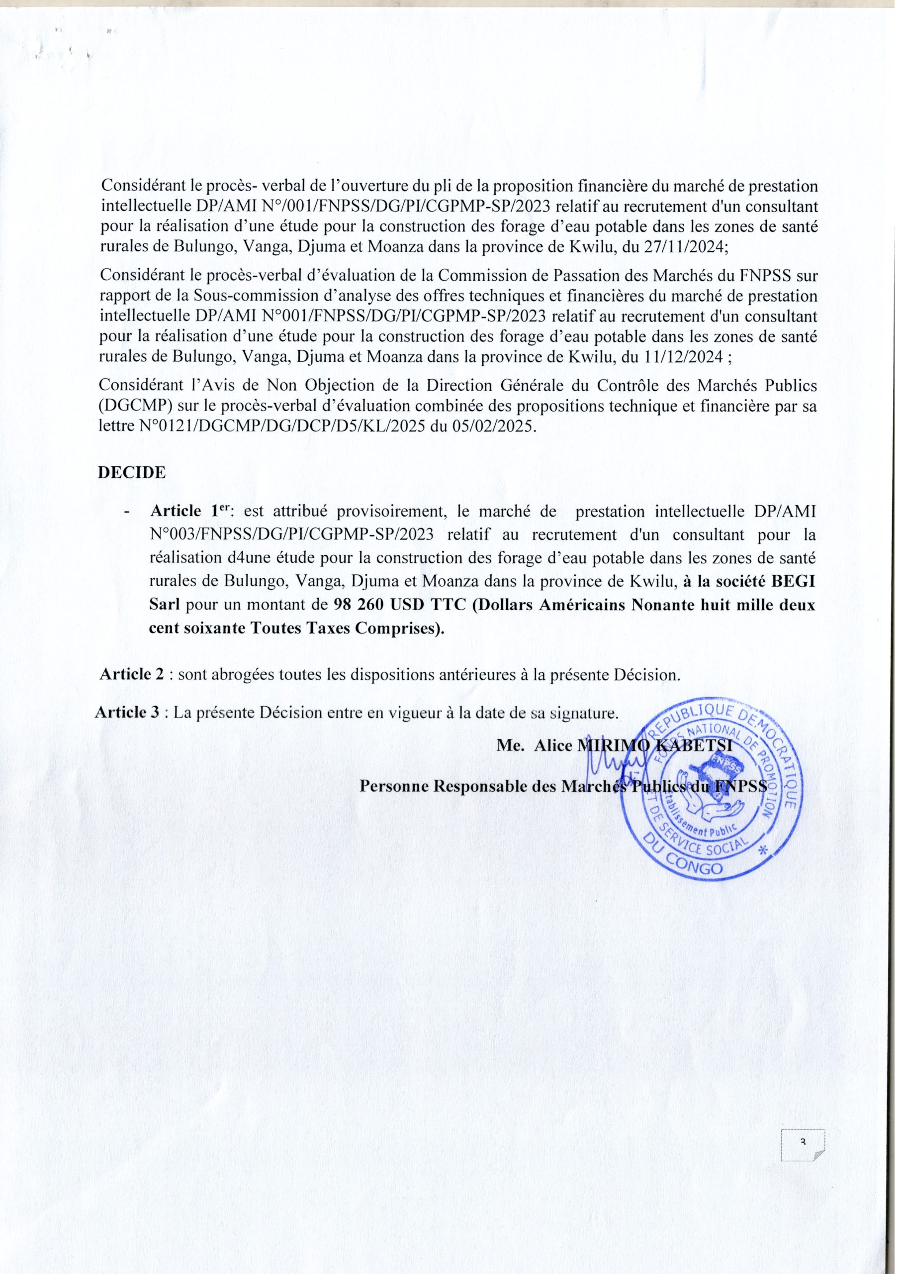 Attribution provisoire du Fonds National de Promotion et de Service Social (FNPSS) accordée à la société BEGI relative au Recrutement d’un consultant pour la réalisation d’une étude pour la construction des Forage d’eau potable dans les Zones de santé rurales Bulungo, Vanga, Djuma et dans la province de Kwilu.