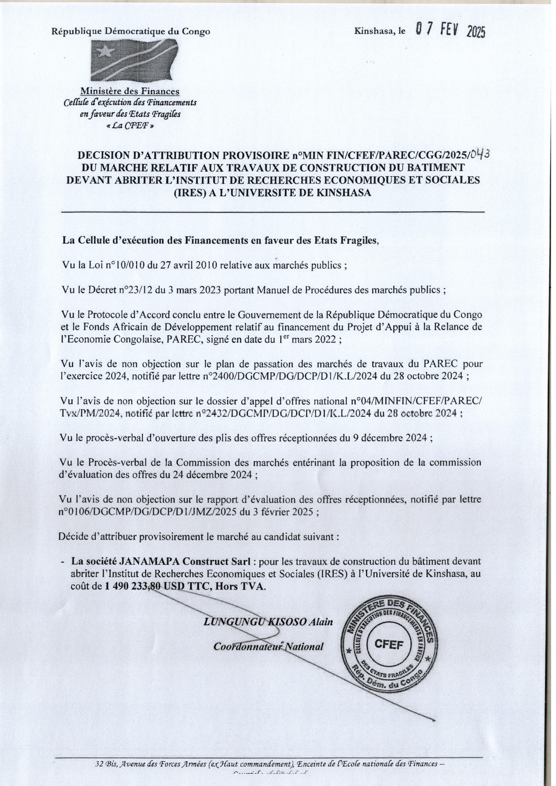 Décision d’attribution provisoire accordée à la société JANAMAPA Construct relative aux travaux de construction du Bâtiment devant abriter l’Institut de Recherches Economiques et Sociales (IRES) à l’UNIVESITE DE KINSHASA