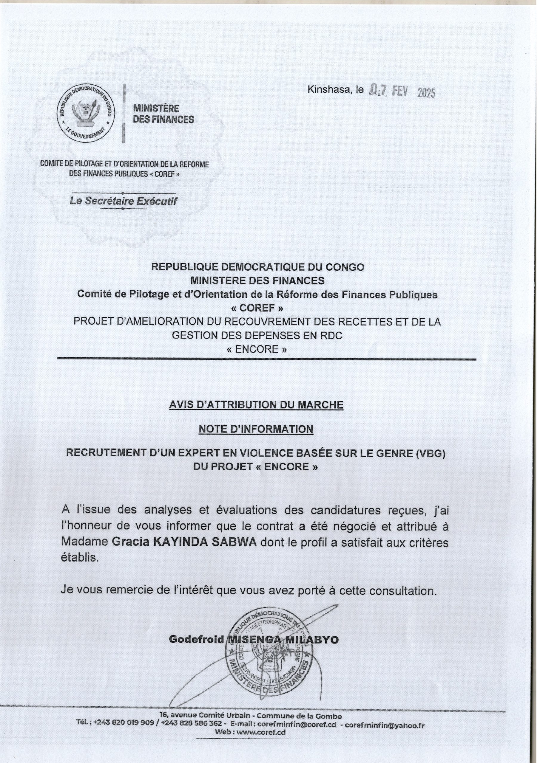 Attribution provisoire accordée à Madame Gracia KAYINDA SABWA relative au recrutement d’un Expert en violence basée sur le genre (VBG) du projet “ENCORE”