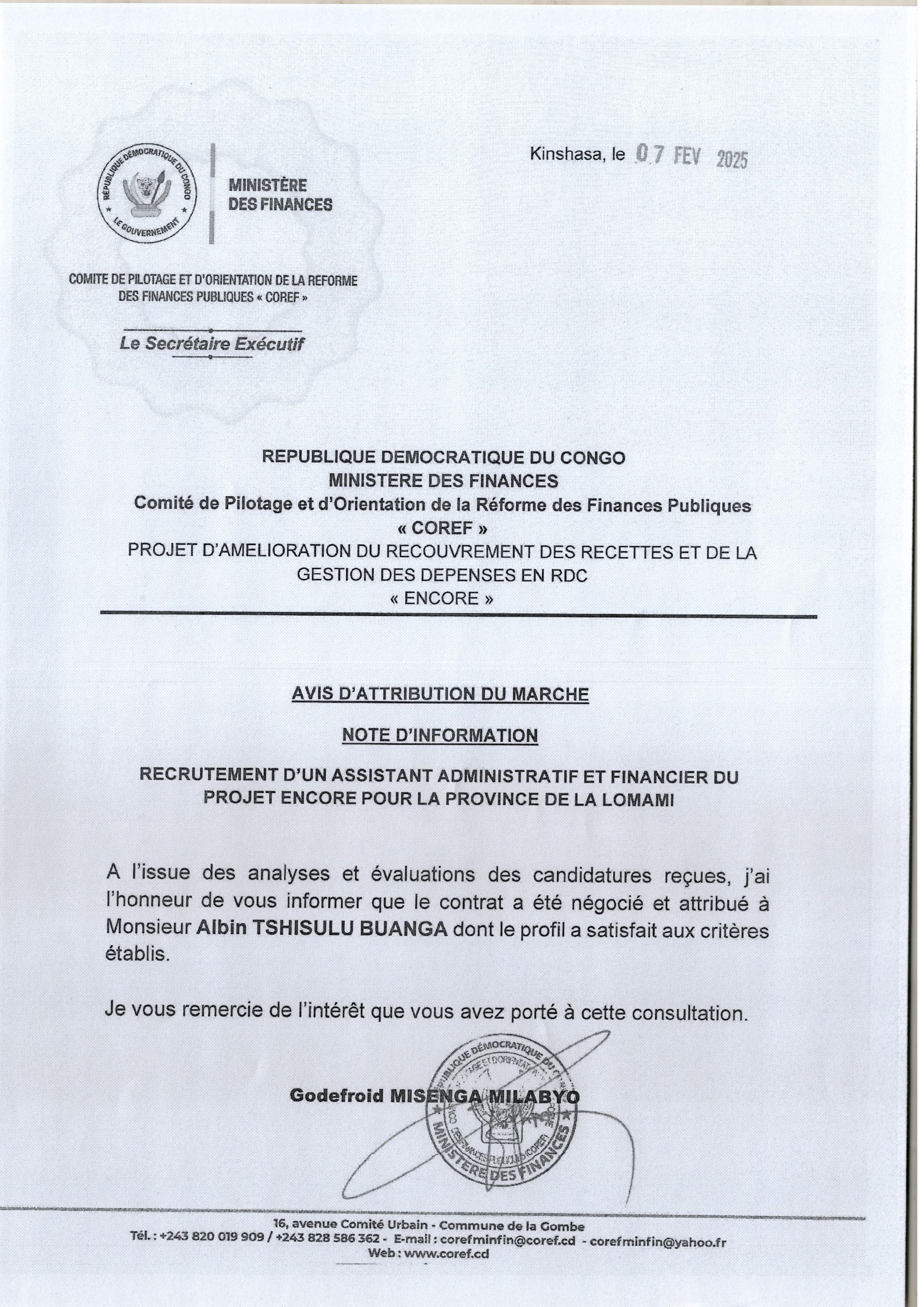 Attribution accordée à Monsieur Albin TSHISULU BUANGA relative au recrutement d’un Assistant Administratif et financier du Projet Encore pour la Province de la Lomami.