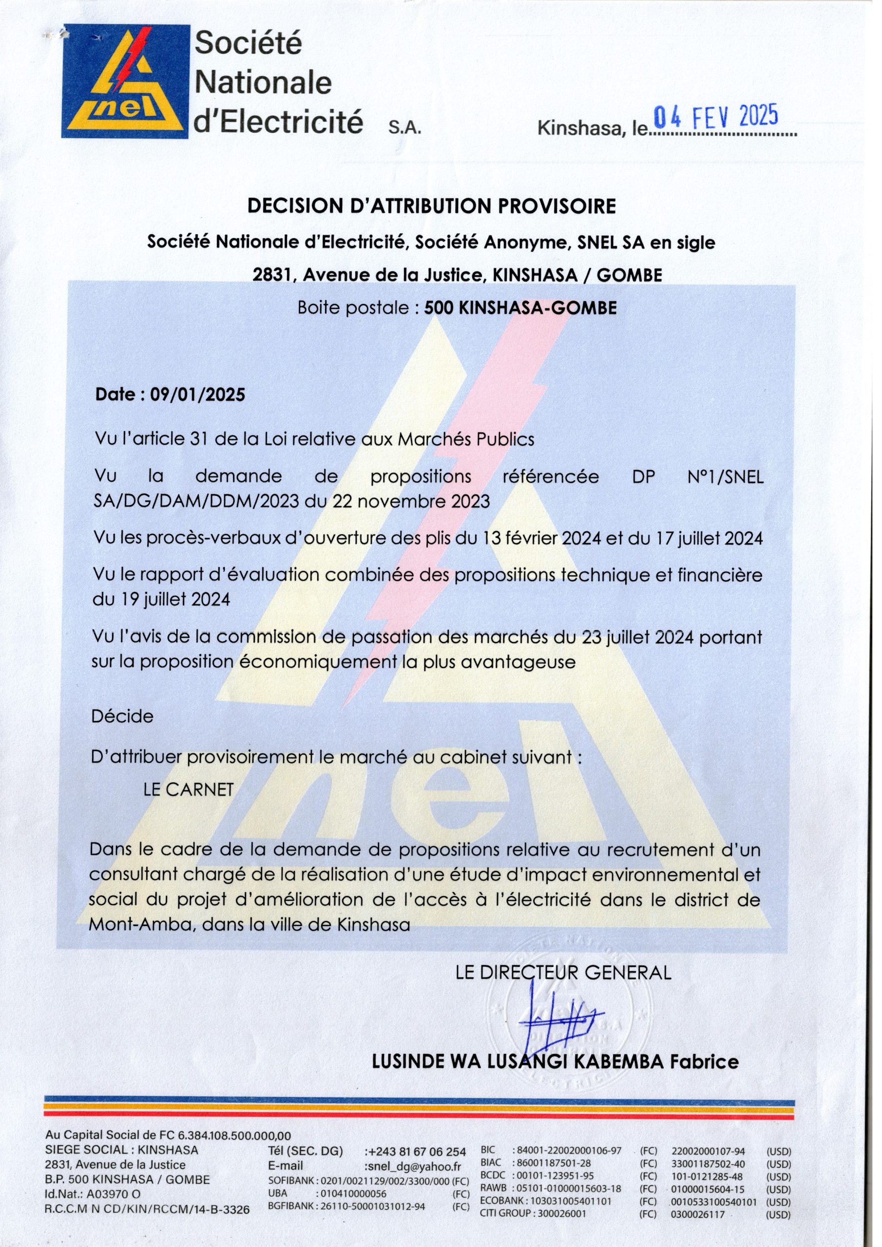 Attribution provisoire accordée au cabinet LE CARNET relative au recrutement d’un consultant chargé de la réalisation d’une étude d’impact environnemental et social du projet d’amélioration de l’accès à l’électricité dans le district de Mont-Amba, dans la ville de Kinshasa.