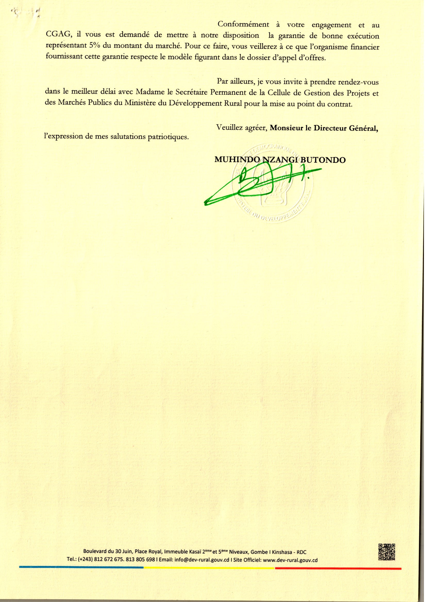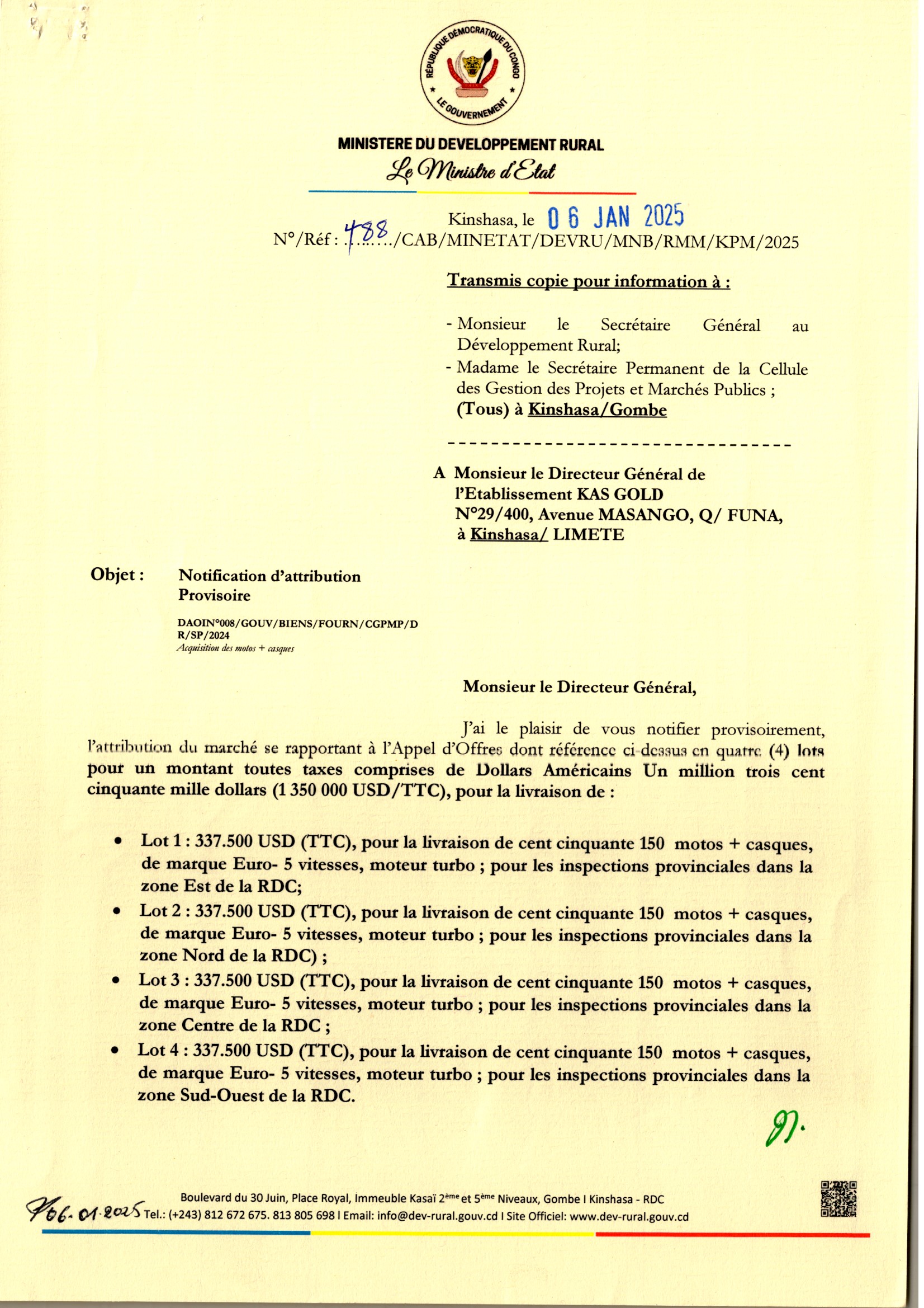 Attribution provisoire accordée à l’Etablissement KAS GOLD relative à l’acquisition des six cent (600) motos+casques pour les inspections provinciales (lot 1,2,3et 4).