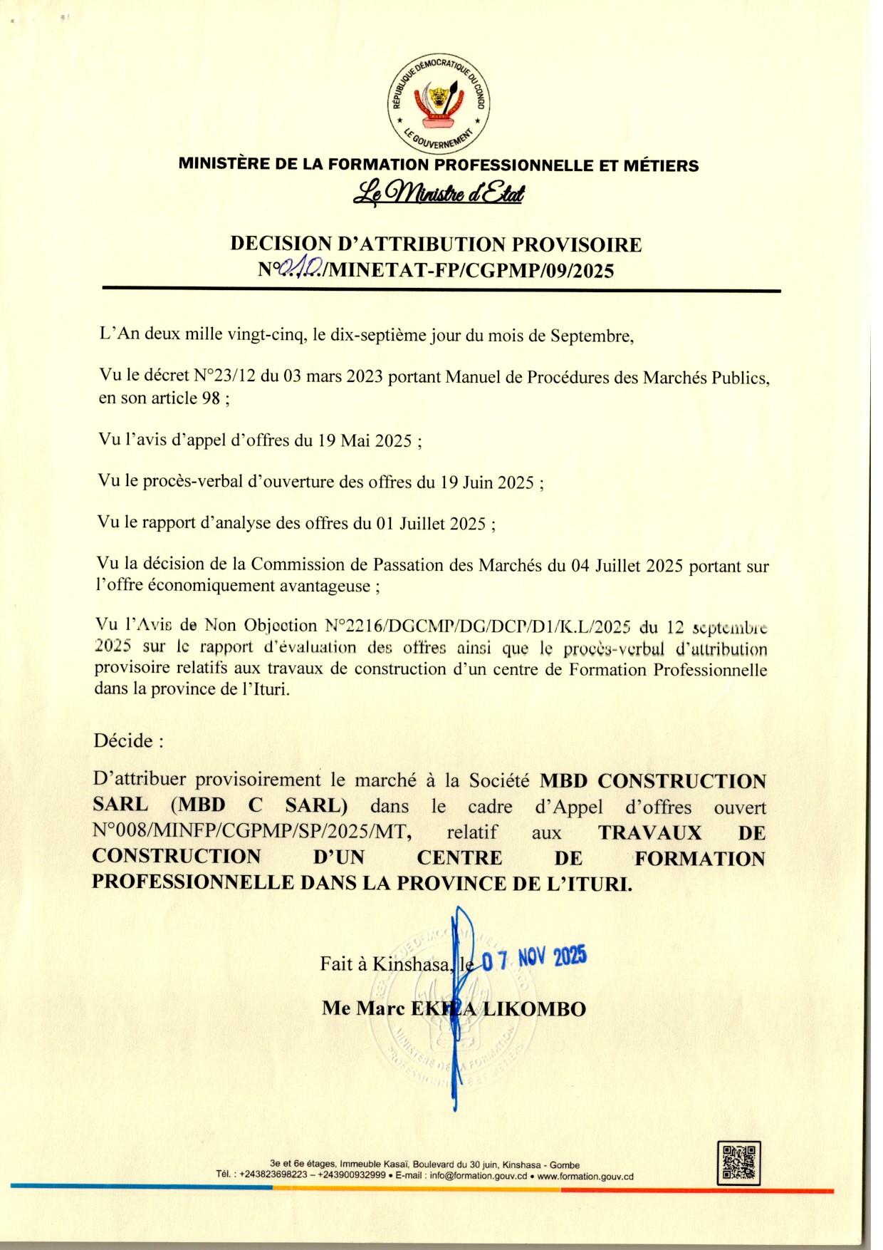 Attribution provisoire accordée à la société MBD CONSTRUCTION relative aux travaux de construction d’un centre se formation Professionnelle dans la province de l’ITURI