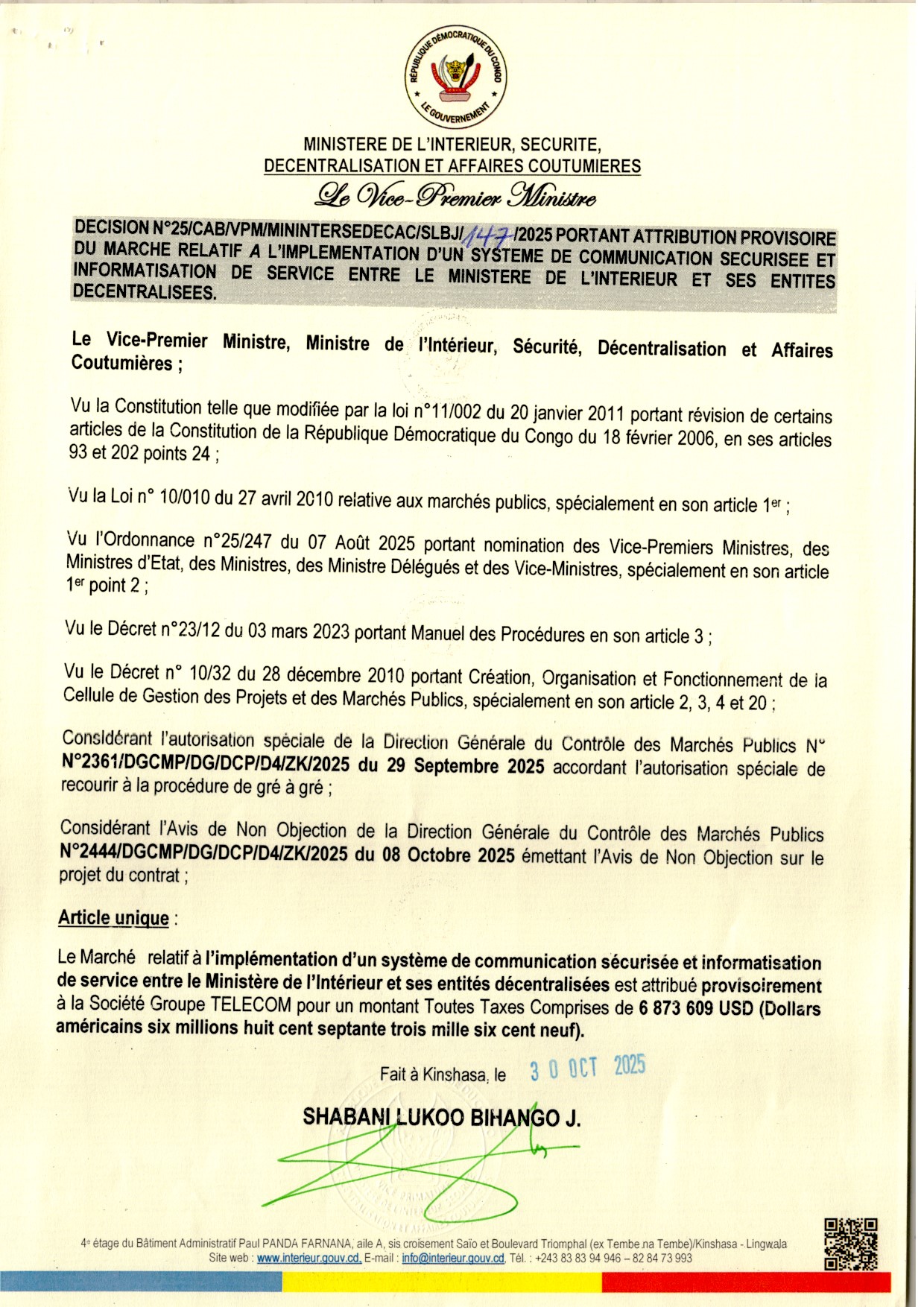 Attribution provisoire accordée à la société Groupe TELECOM relative à l’Implémentation d’un système de communication sécurisée et information de service entre le Ministère de l’Intérieur et ses entités Décentralisées.