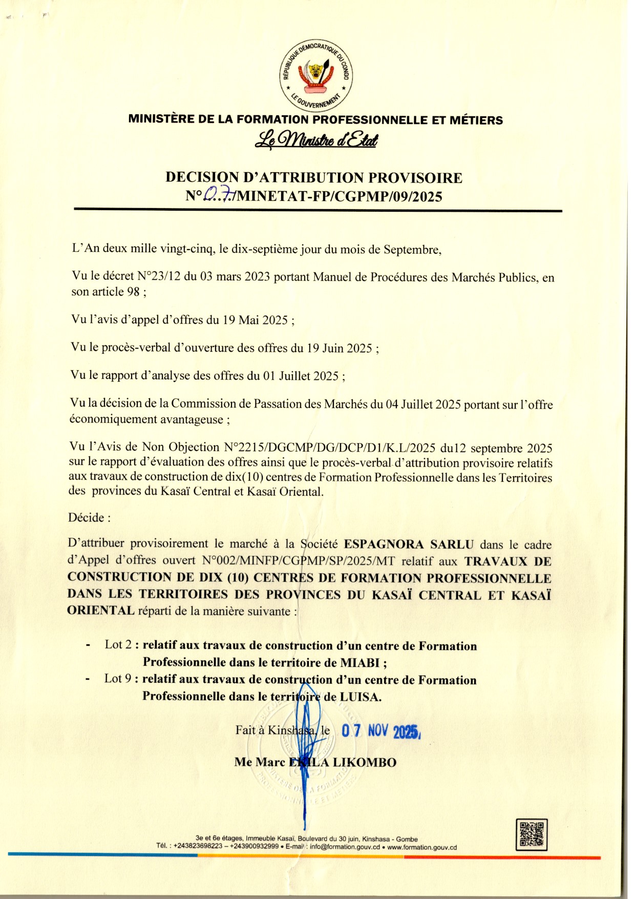 Attribution provisoire accordée à la société ESPAGNORA SARLU relative aux travaux de construction de dix (10) centres se formation Professionnelle dans les territoires des provinces du KASAI CENTRAL ET KASAI ORIENTAL reparti en deux lots