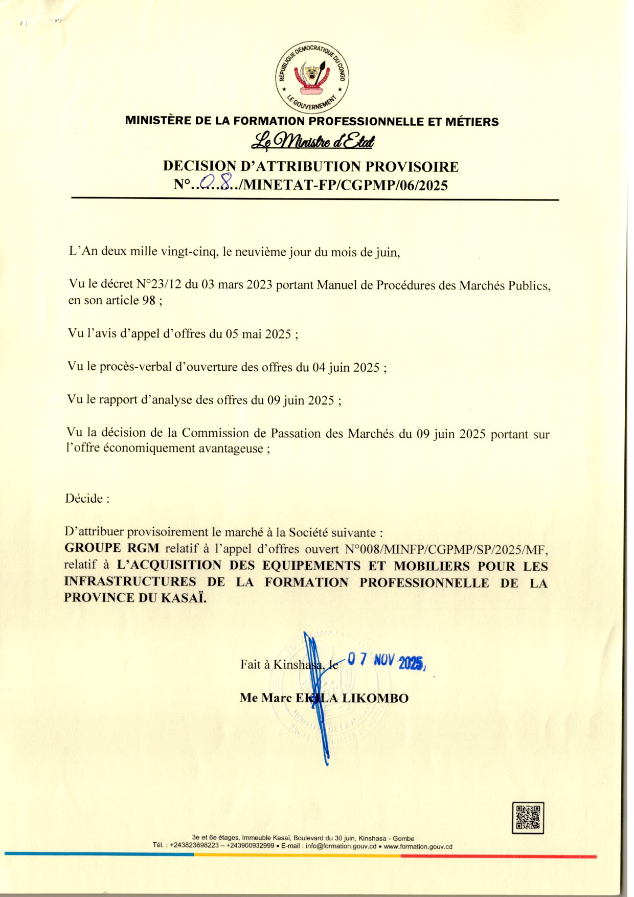 Attribution provisoire accordée au Groupe RGM relative à l’acquisition des équipements et mobiliers pour les Infrastructures de la Formation Professionnelle de la Province du Kasai