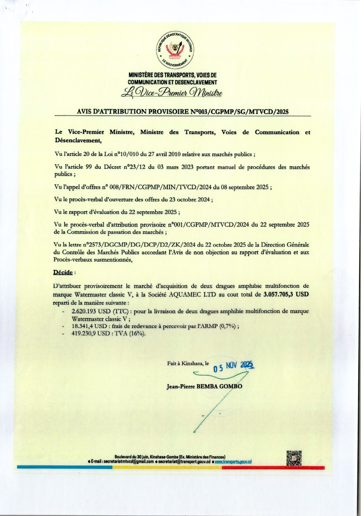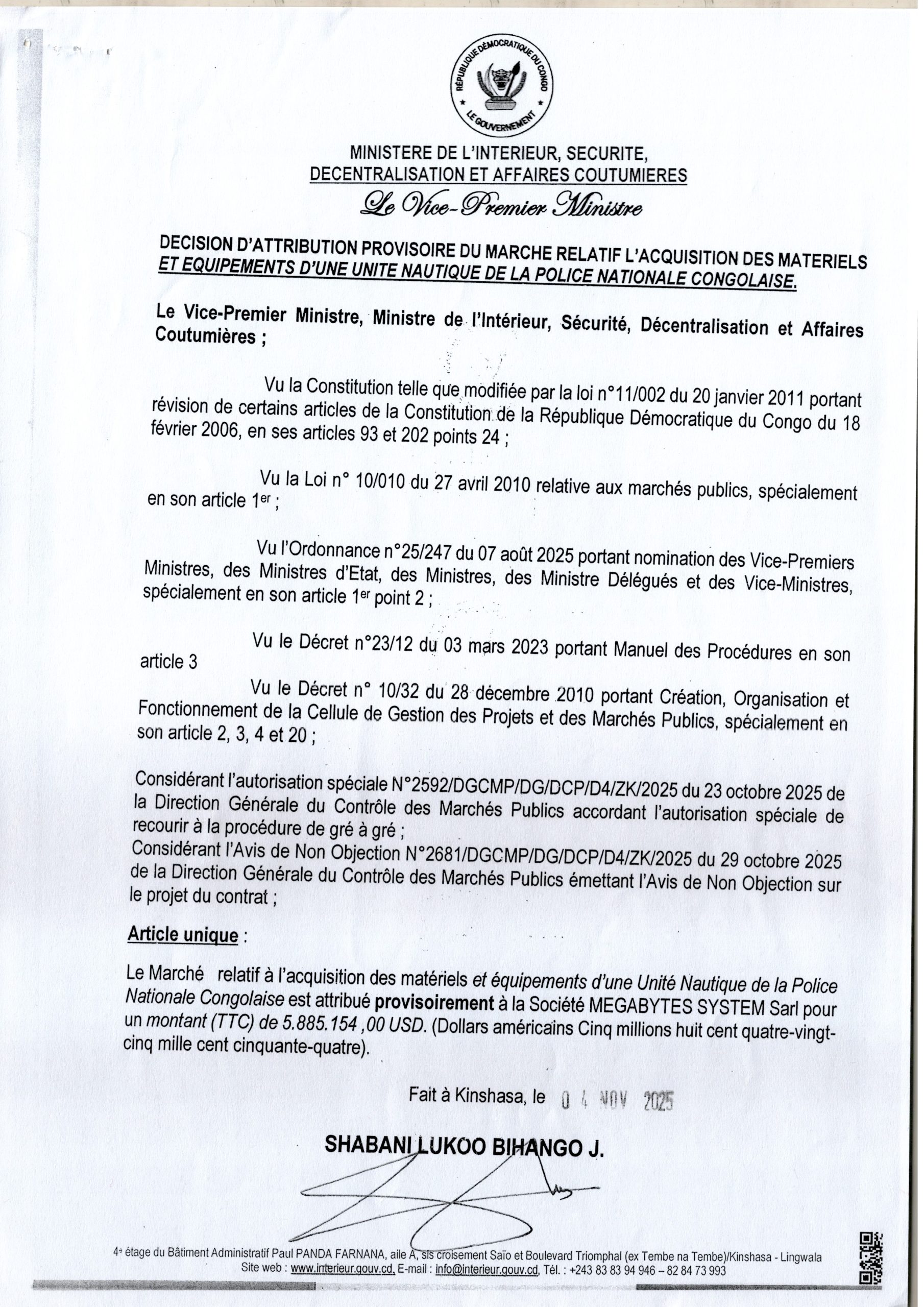 Attribution provisoire accordée à la société MEGABYTES SYSTEM relative à l’acquisition des matériels et équipements d’une Unité Nautique de la Police Nationale Congolaise.