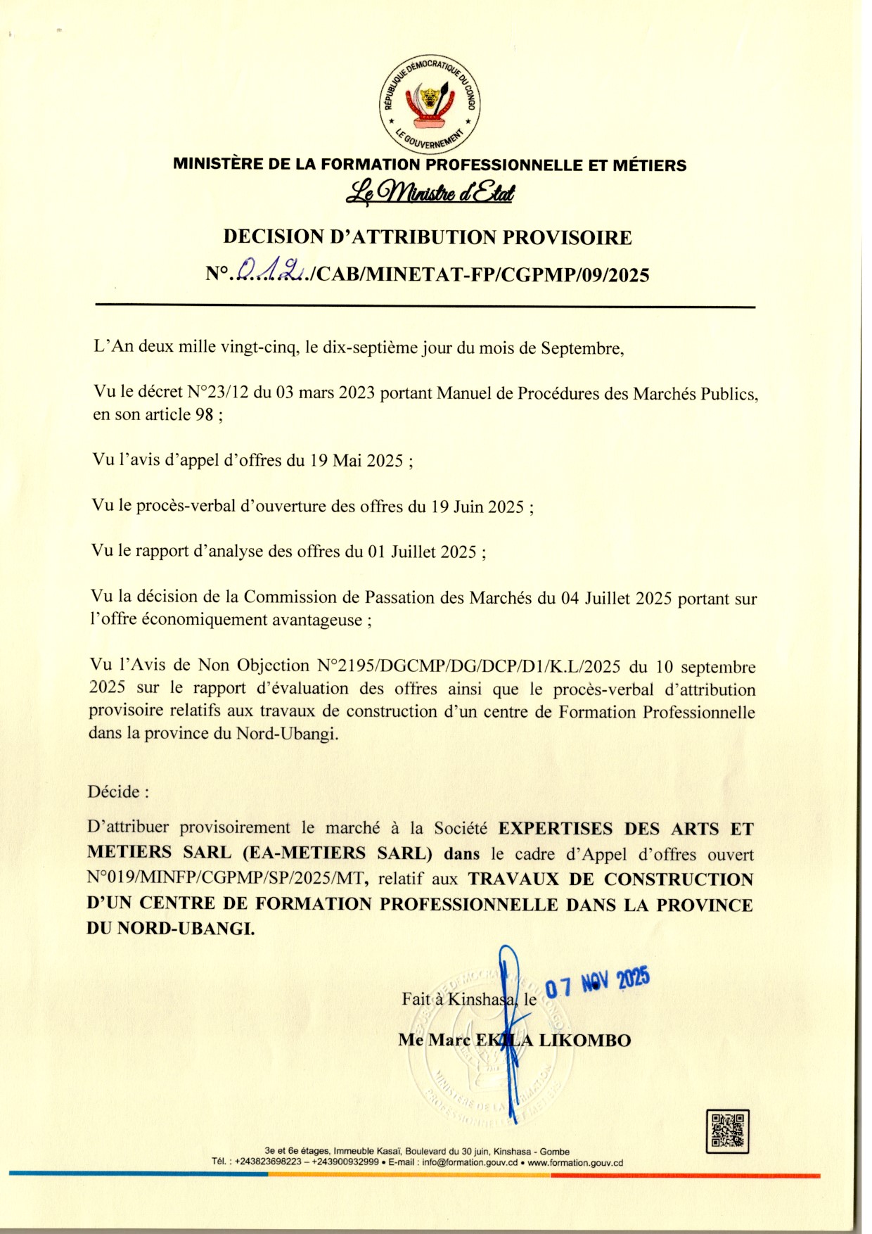 Attribution provisoire accordée à la société Expertises des ARTS et METIERS sarl (EA-METIERS SARL) relative aux travaux de construction d’un centre de Formation Professionnelle dans la province du Nord-Ubangi