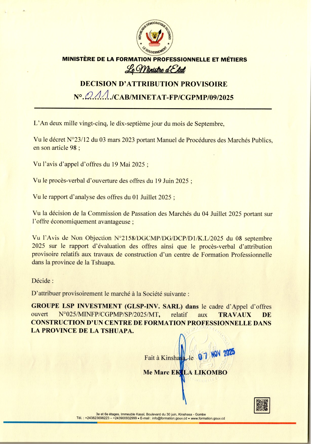 Attribution provisoire accordée au Groupe LSP INVESTMENT (GLSP-INV) relative aux travaux de construction d’un centre de Formation Professionnelle dans la province de la Tshuapa