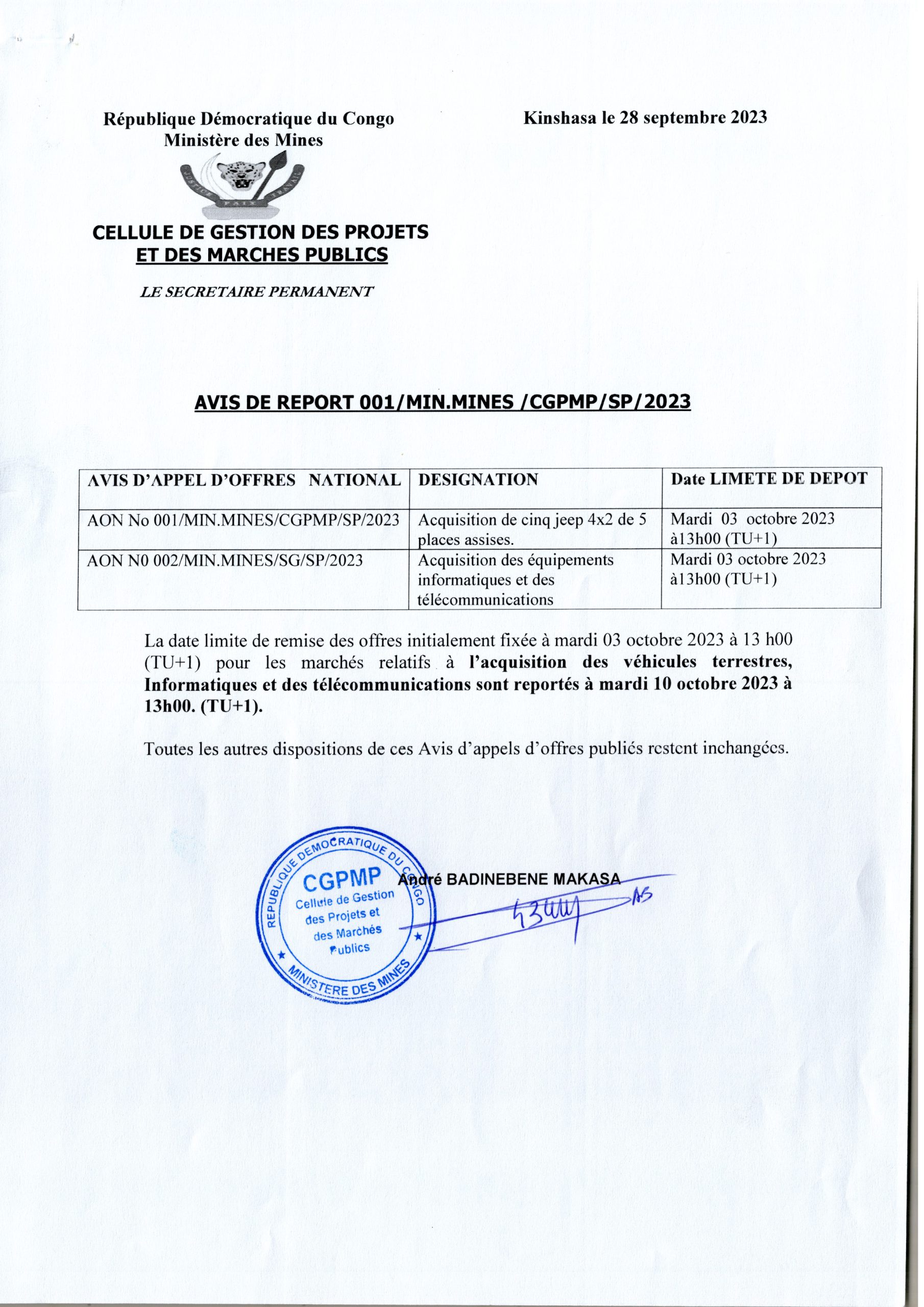 Avis de Report du ministère des Mines relatif à l’acquisition de cinq jeep 4×2 de places assises et acquisition des équipements informatiques et des télécommunications.