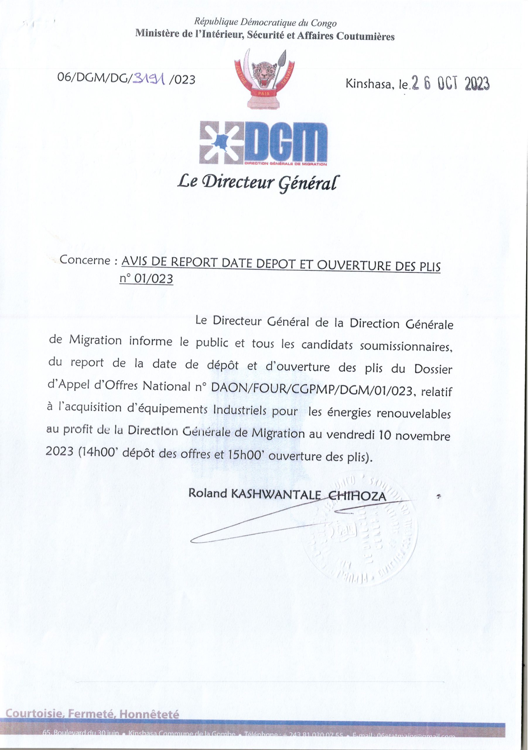 Avis de Report de date de dépôt et de l’ouverture des plis de la DGM relatif à l’acquisition d’équipements Industriels pour les énergies renouvelables au profit de la Direction Générale de Migration au vendredi 10 novembre 2023.