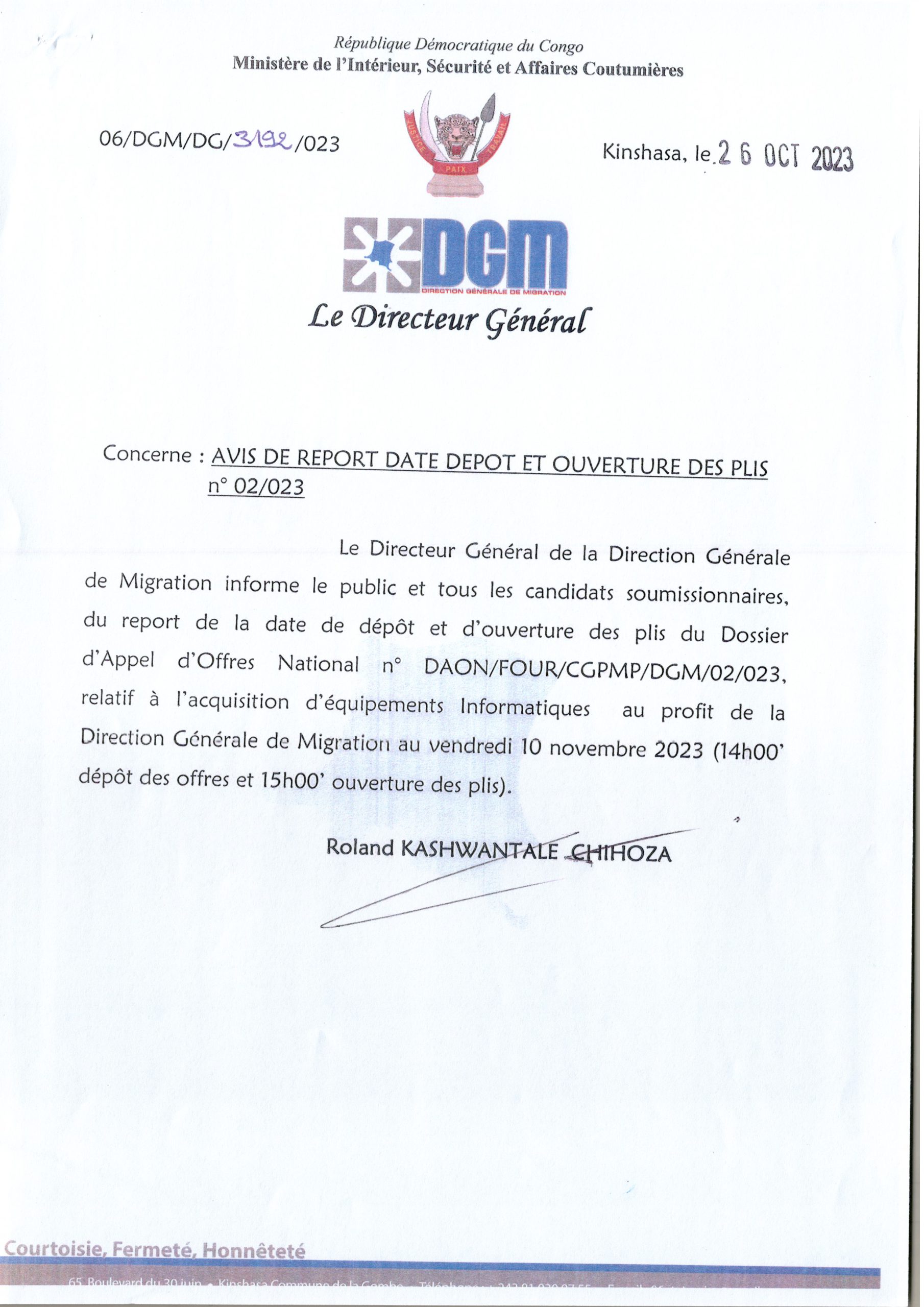 Avis de report date dépôt et Ouverture des plis n°02/023 de la DGM relatif à l’acquisition d’équipements Informatiques au profit de la Direction Générale de Migration.