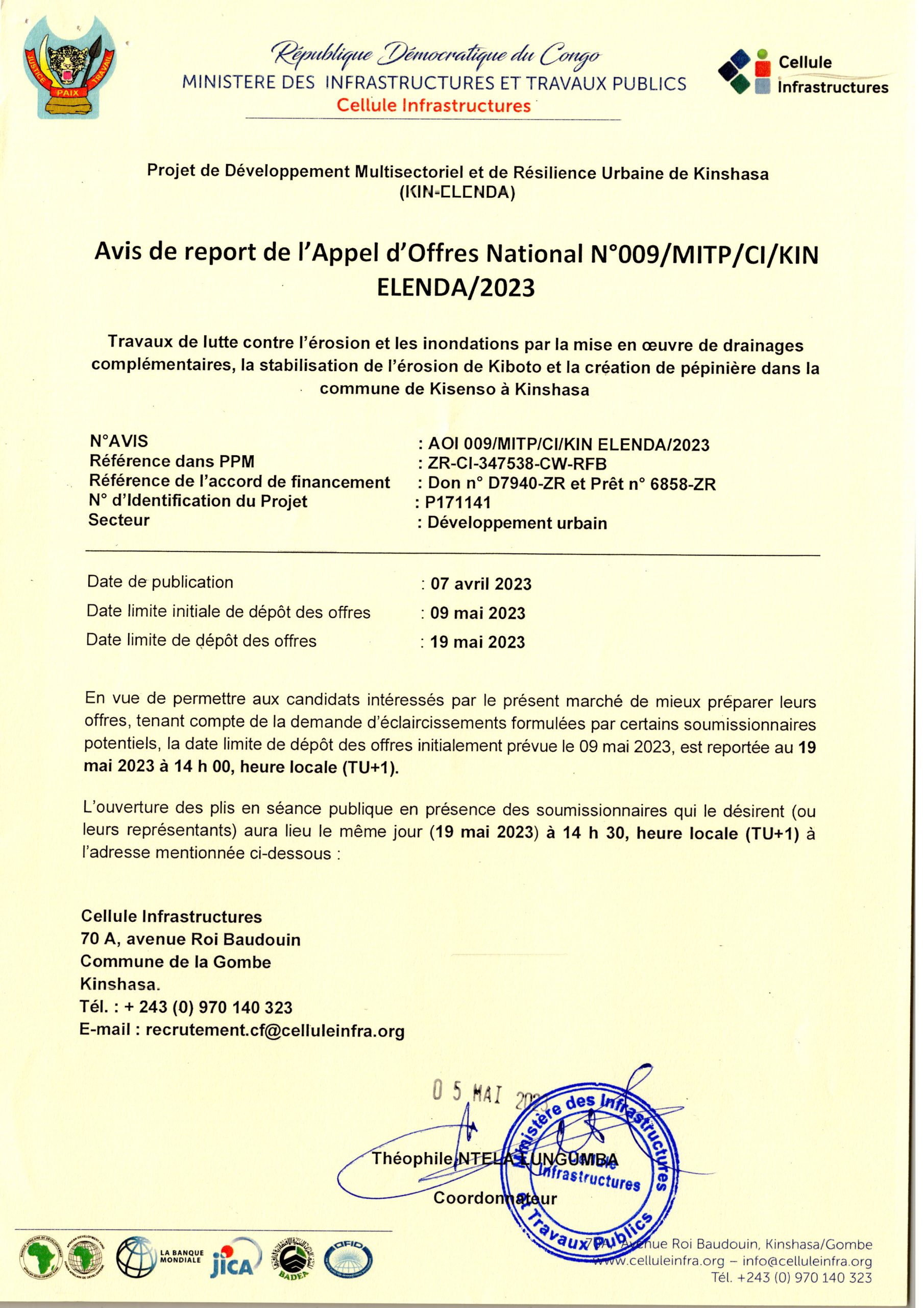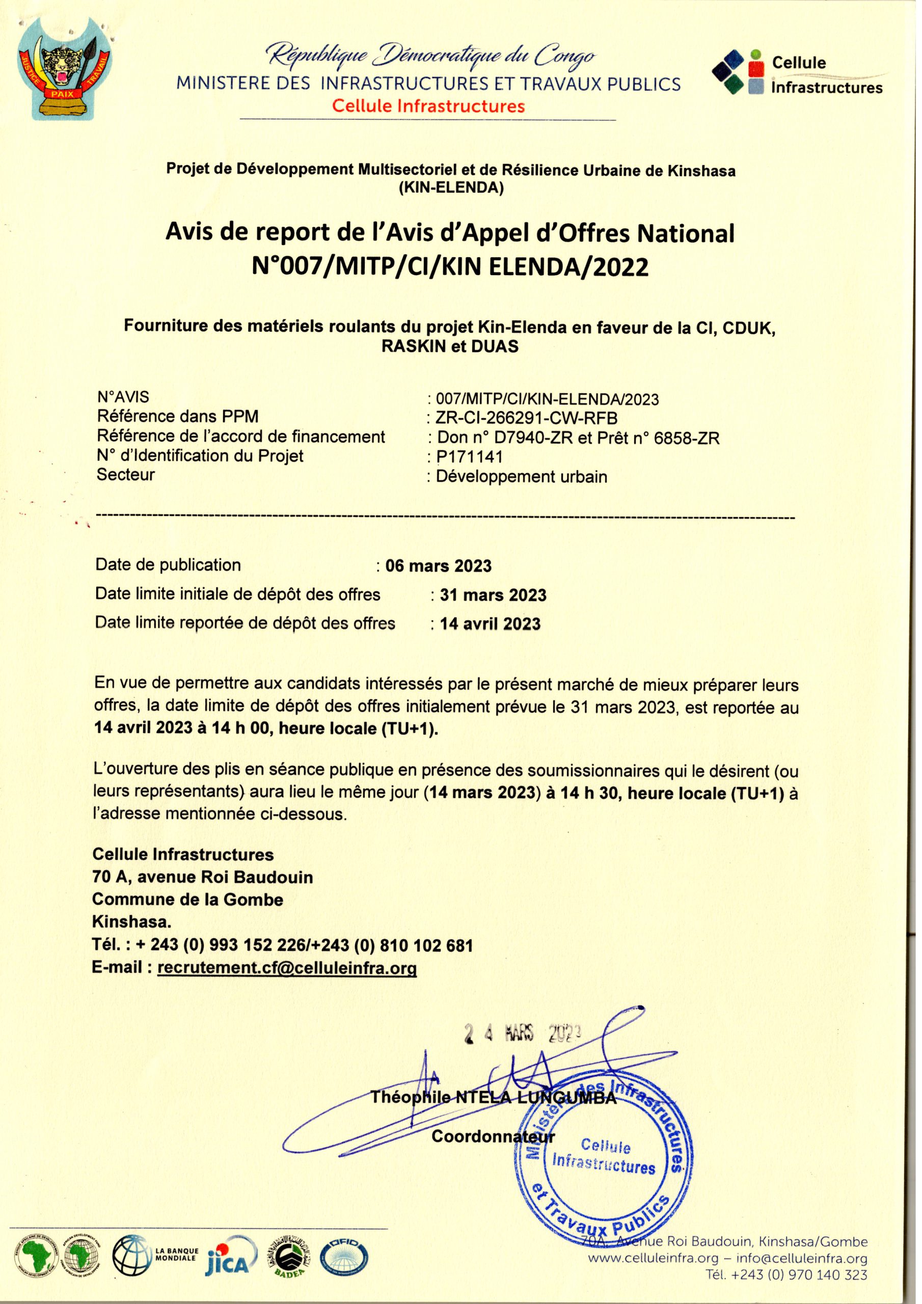 AVIS DE REPORT DE L’AVIS D’APPEL D’OFFRE NATIONAL RELATIF A LA FOURNITURE DES MATERIELS ROULANTS DU PROJETS KIN-ELENDA EN FAVAEUR DE LA CI, CDUK, RASKIN ET DUAS.