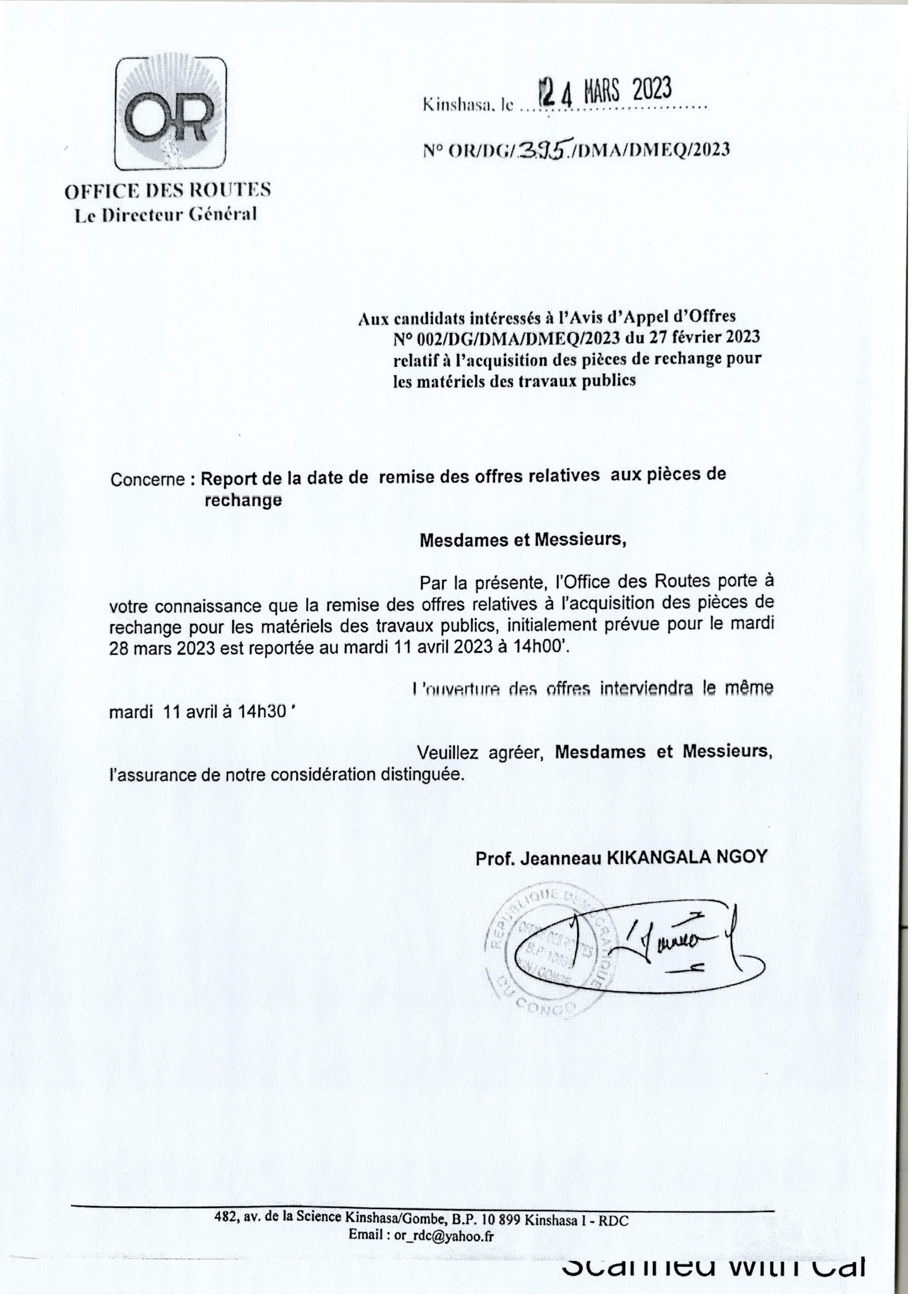 Report de la date de remise des offres relatives aux pièces de rechange aux candidats intéressés à l’Avis d’appel d’offres N°002/DG/DMA/DMEQ/2023 du 27 février 2023 relatif à l’acquisition des pièces de rechange pour les matériels des travaux publics.