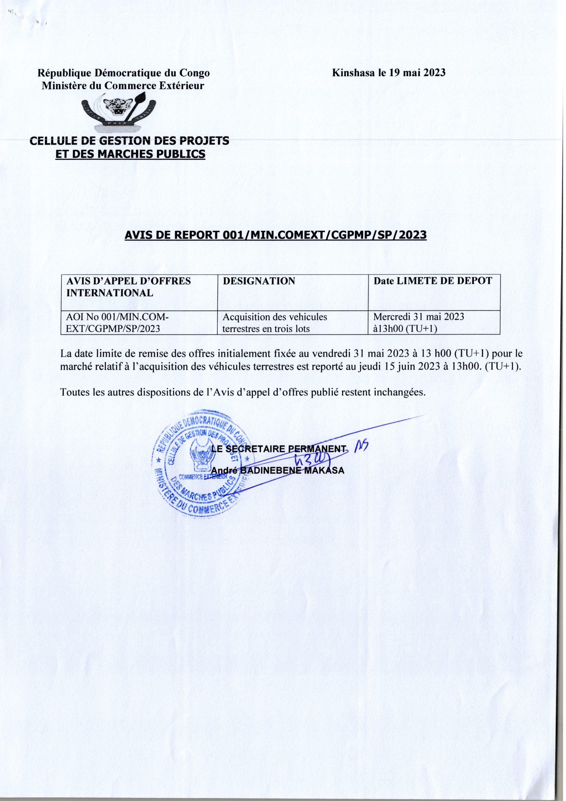 AVIS DE REPORT N°001/MIN.COMEXT/CGPMP/SP/2023 RELATIF A L’ACQUISITION DES VEHICULES TERRESTRES EN TROIS LOTS.