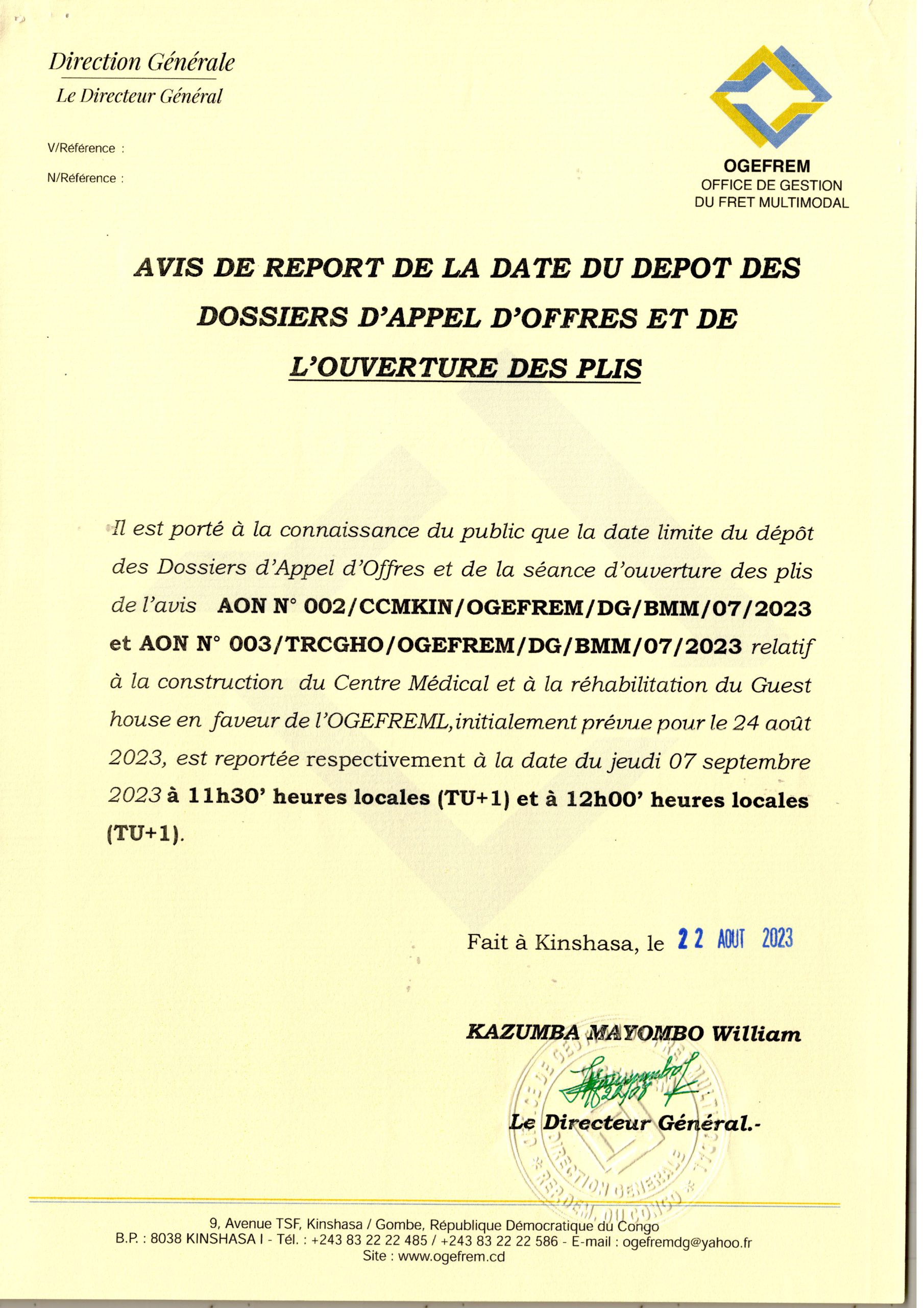 AVIS DE REPORT DE LA DATE DU REPORT DES DOSSIERS D’APPEL D’OFFRES ET DE L’OUVERTURE DE PLIS RELATIF À LA CONSTRUCTION DU CENTRE MÉDICAL ET À LA RÉHABILITATION DU GUEST HOUSE EN FAVEUR DE L’OGEFREM.