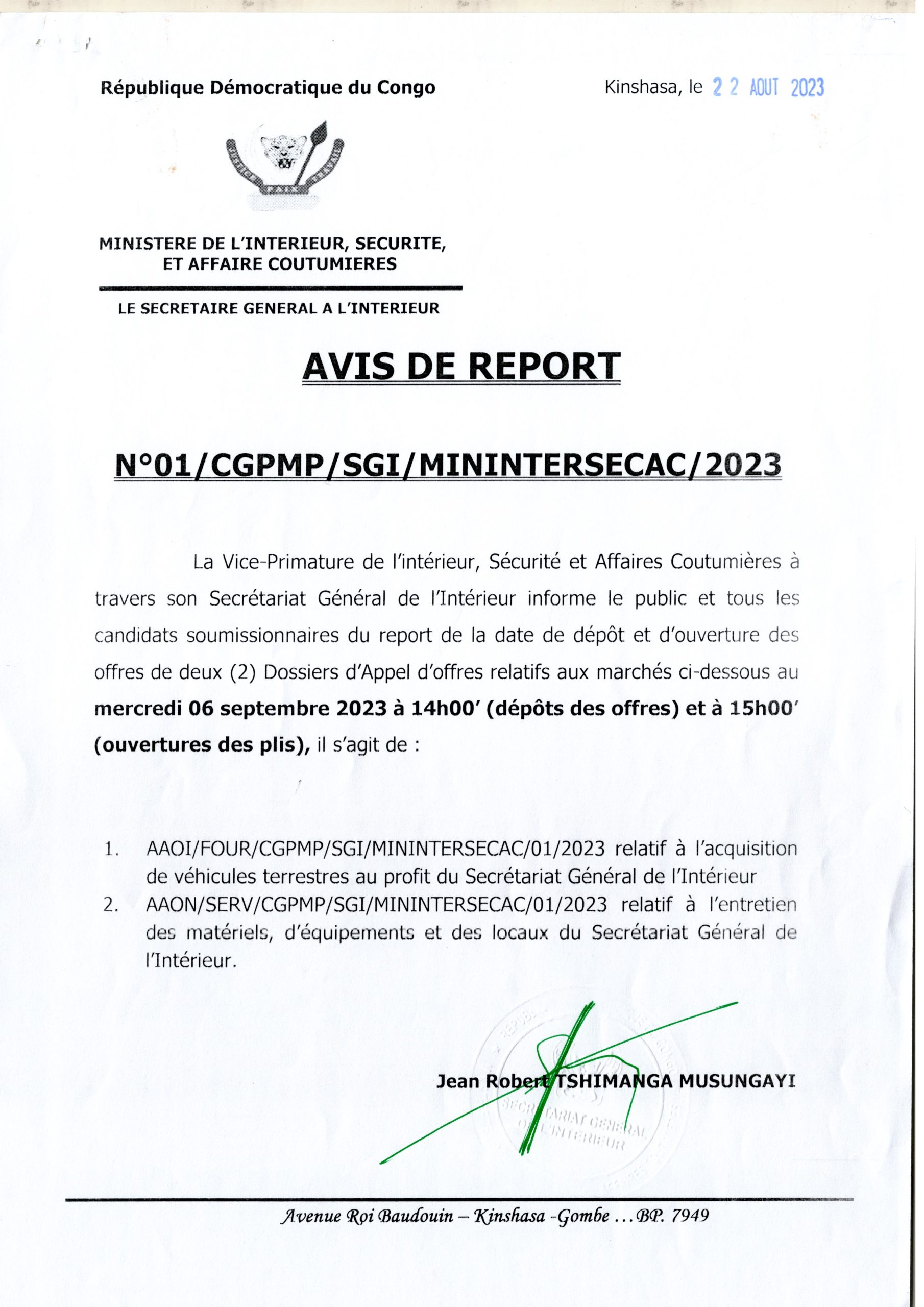 Avis de report du Ministère de l’Intérieur, Sécurité, et Affaire Coutumières relatif à l’Entretien des matériels, d’équipements et des locaux du Secrétariat Général de l’Intérieur