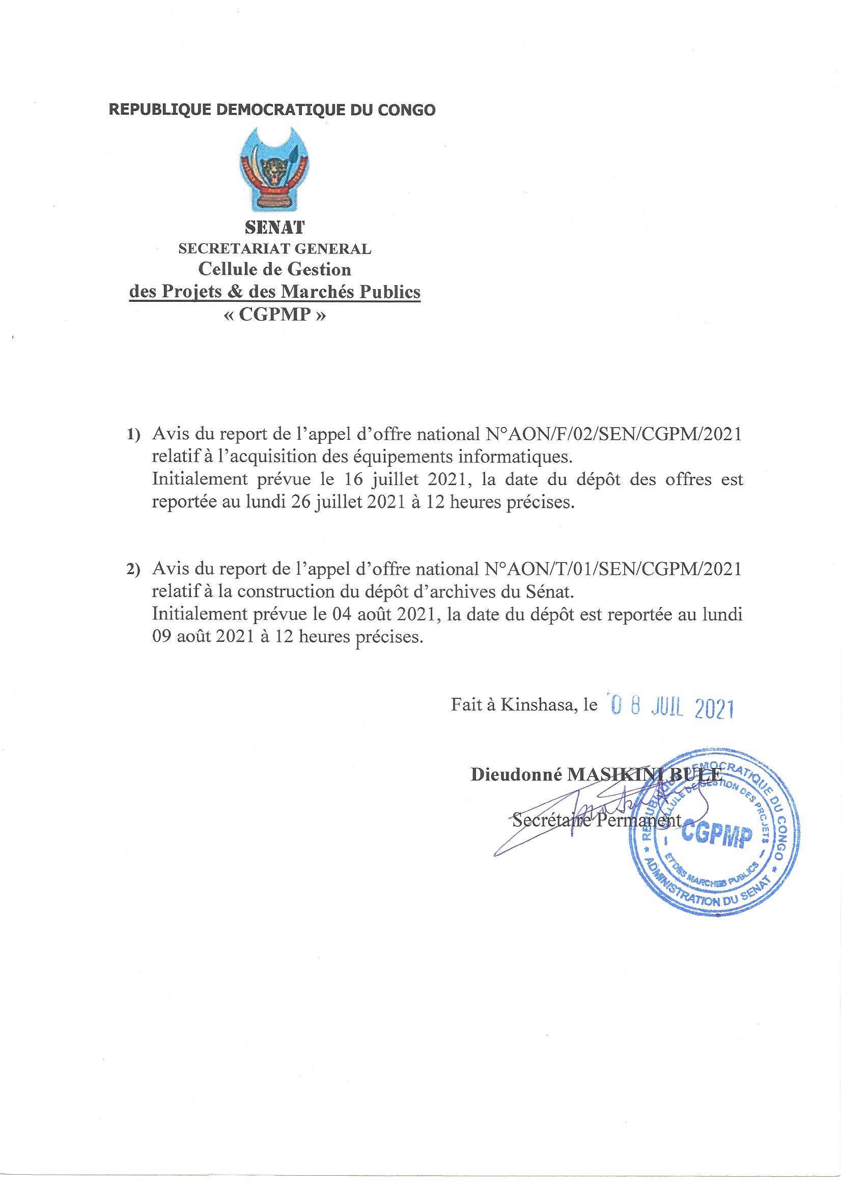 AVIS DU REPORT DE L’APPEL D’OFFRE NATIONAL N° AON/F/01/SEN/CGPMP/2021 RELATIF A LA CONSTRUCTION DU DEPOT D’ARCHIVES DU SENAT.