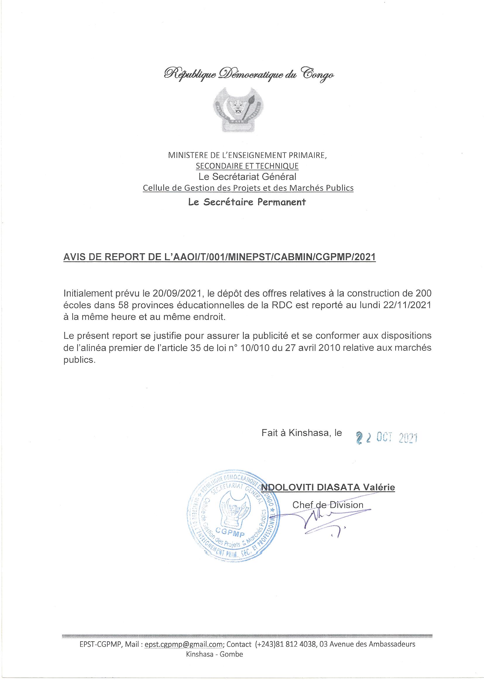 AVIS DE REPORT DE L’AAOI/T/001/MINEPST/CABMIN/CGPMP/2021 RELATIF A LA CONSTRUCTION DE 200 ECOLES DANS 58 PROVINCES EDUCATIONNELLES DE LA RDC.