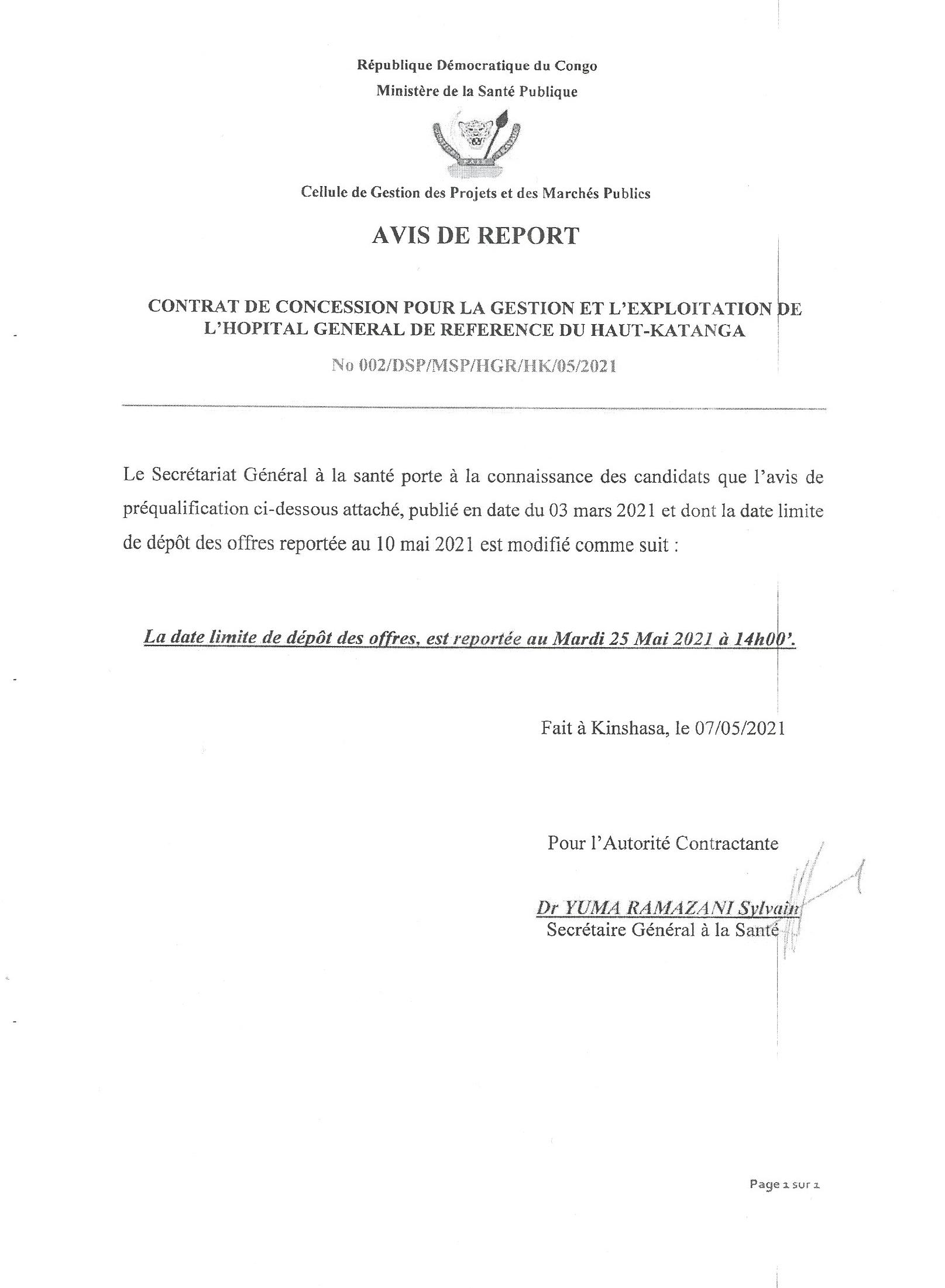 Avis de Report de préqualification, publié en date du 03 mars et dont la date limite de dépôt des offres des offres reporée au 10 mai 2021, est reportée au Mardi 25 Mai 2021 à 14h00.