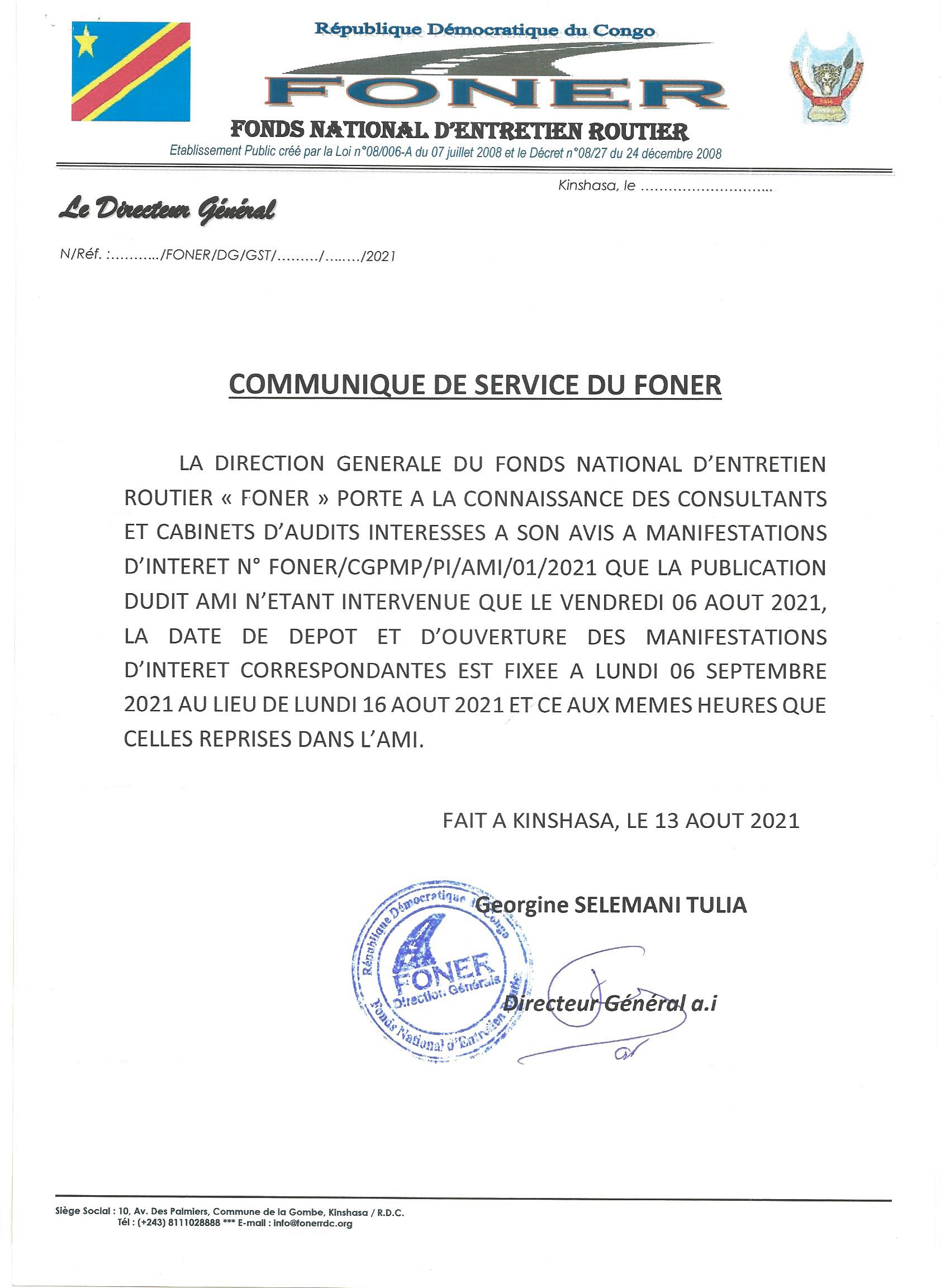 AVIS DE REPORT DU MARCHE RELATIF AU RECRUTEMENT DES CONSULTANTS CHARGES DE REALISER LES AUDITS TECHNIQUES ET FINANCIERS DES TRAVAUX D’ENTRETIEN ROUTIER FINANCES PAR LE FONER AU COURS DES EXERCICES BUDGETAIRES 2019 ET 2020