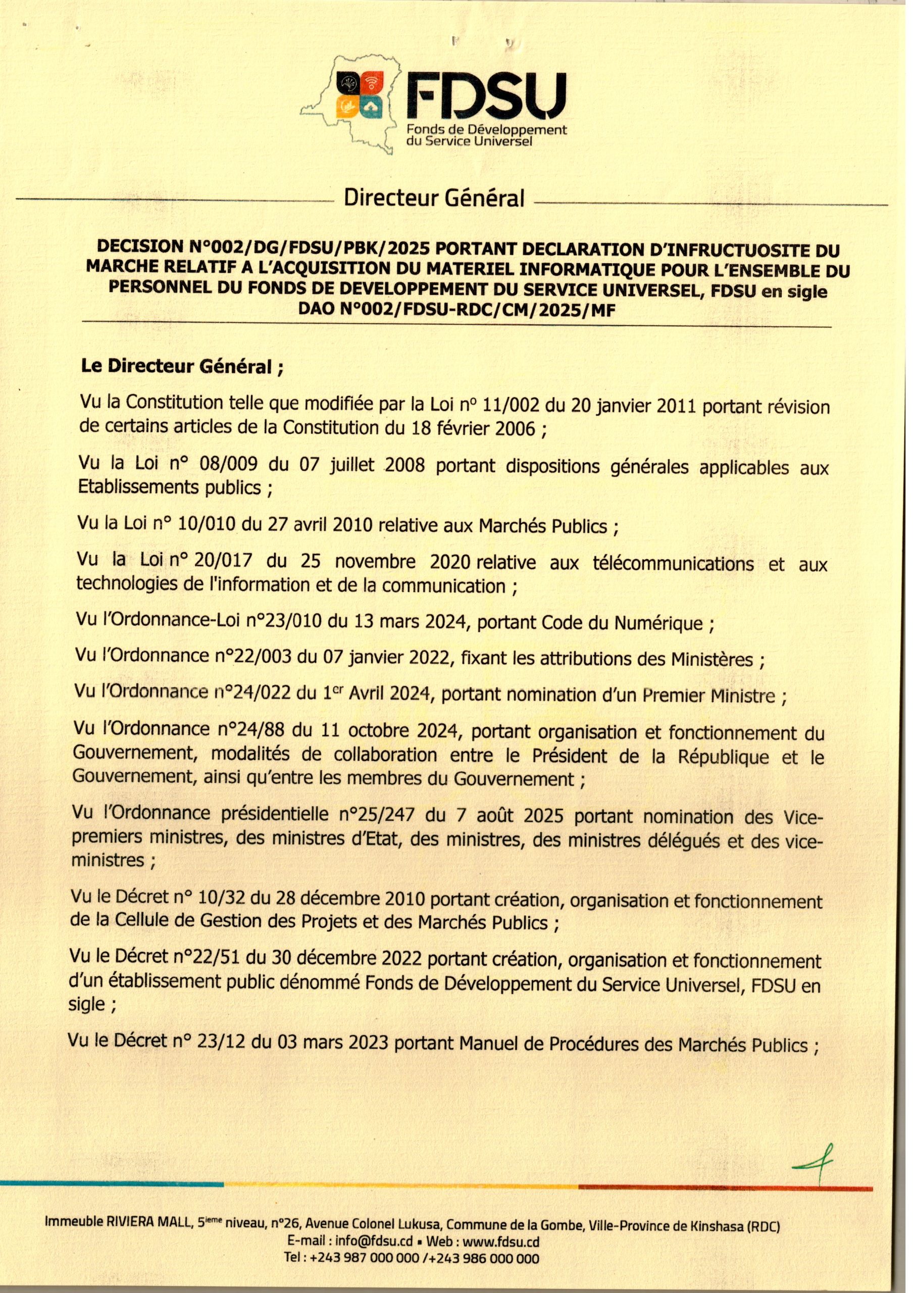 Décision portant déclaration d’infructuosité pour le marché d’acquisition de matériels informatiques, logiciels licences, antivirus, backup énergie et accessoires