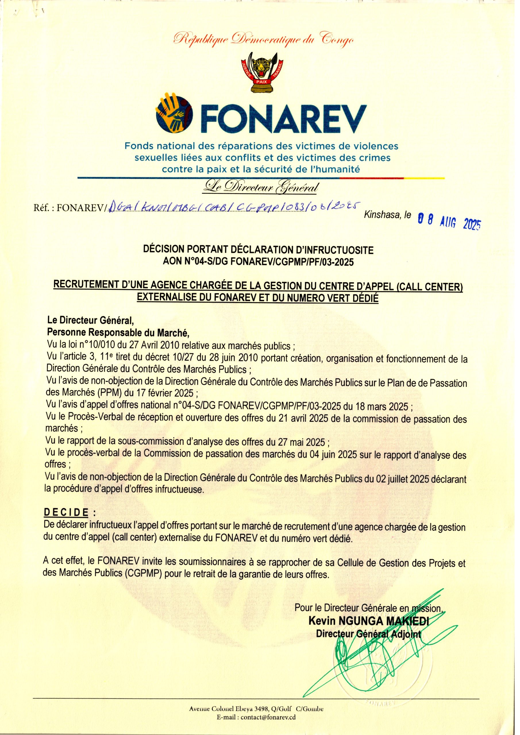Décision portant déclaration d’infructuosité pour le Recrutement d’une Agence chargée de la Gestion du centre d’Appel (CALL CENTER) Externalisé du FONAREV et du Numéro vert dédié