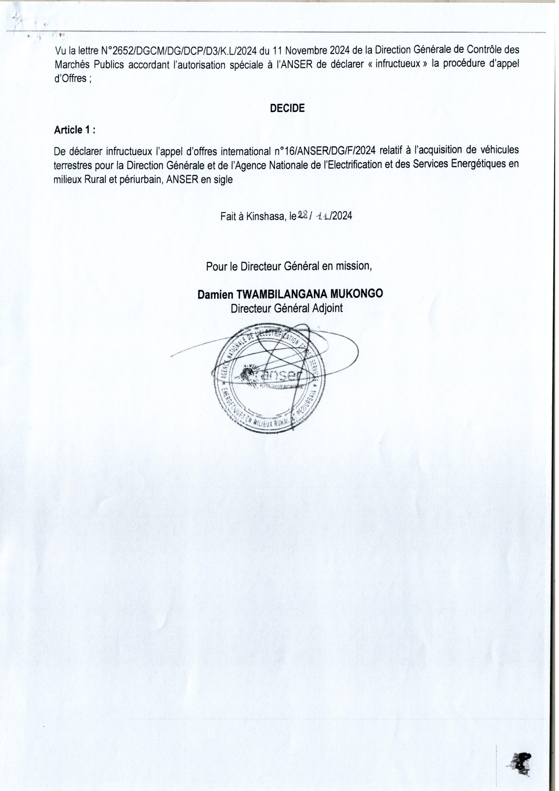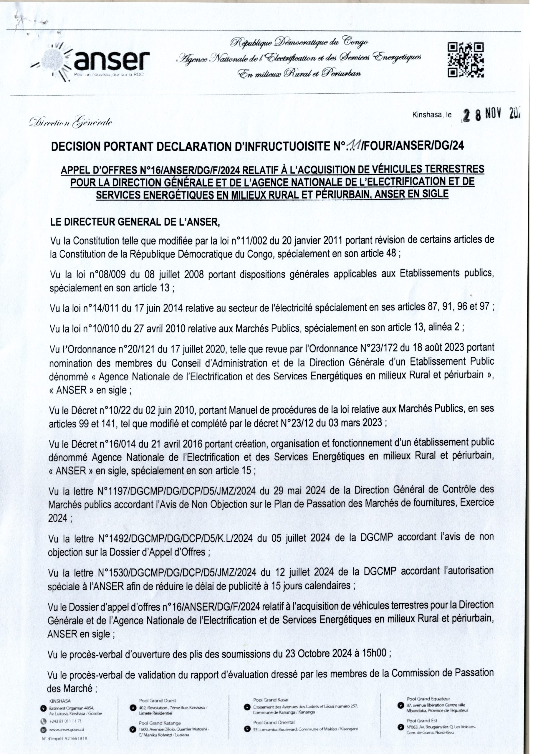 COMMUNIQUE DE SERVICE FONER Décision Portant déclaration d’Infructuosité relatif à l’acquisition de véhicules Terrestres pour la Direction Générale et de l’Agence Nationale de l’Electrification et de services énergétiques en milieux Rural et Périurbain, Anser en sigle COMMUNIQUE DE SERVICE FONER
