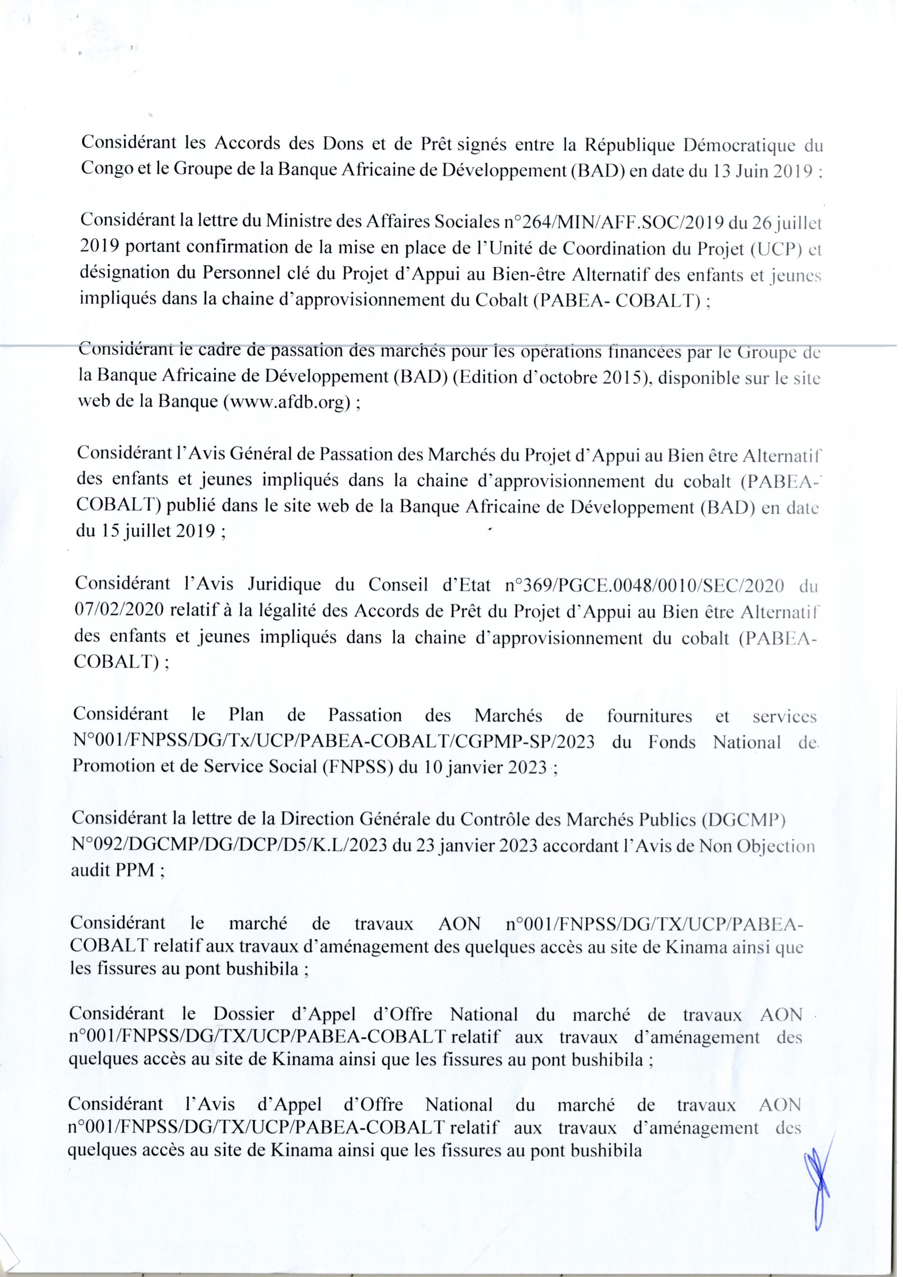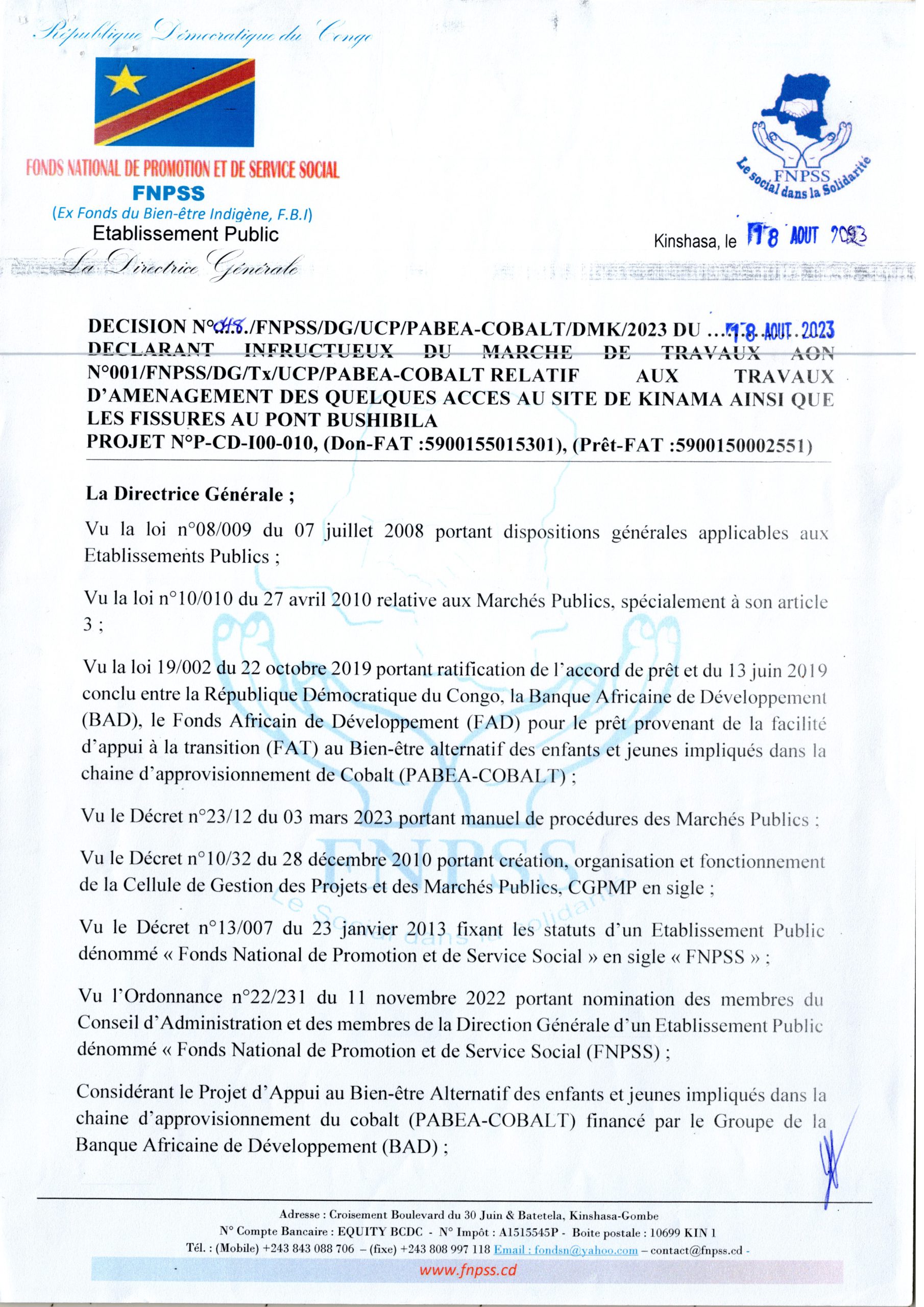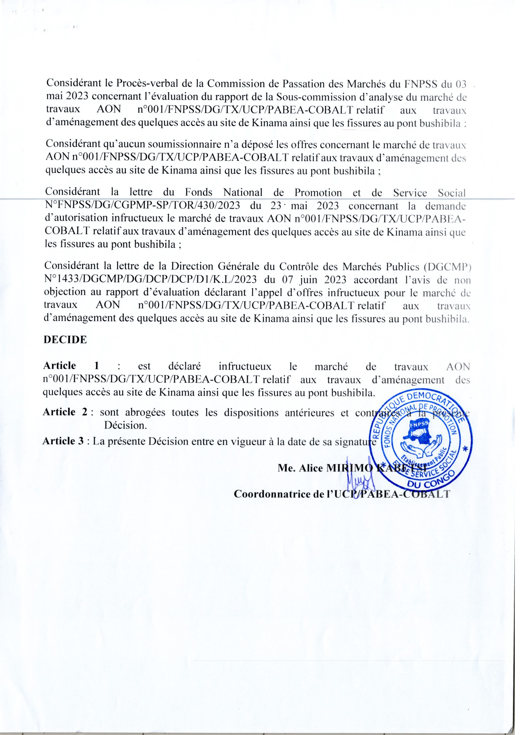Décision N°048/FNPSS/DG/UCP/PABEA-COBALT/DMK/2023 du 18 Aout 2023 déclarant infructueux du marché de travaux AON N°001/FNPSS/DG/Tx/UCP/PABEA-COBALT relatif aux travaux d’aménagement des quelques Accès au Site de Kinama ainsi que les Fissures au Pont Bushibila