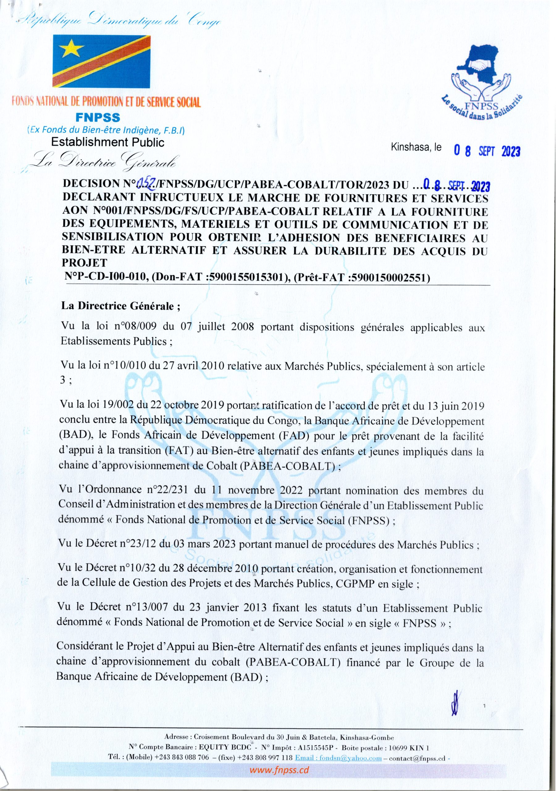 DECISION N°052/FNPSS/DG/UCP/PABEA-COBALT/TOR/2023 DU 08/SEPT/2023 DÉCLARANT INFRUCTUEUX MARCHÉ RELATIVE A LA FOURNITURES DES ÉQUIPEMENTS, MATÉRIELS ET OUTIL DE COMMUNICATION ET DE SENSIBILISATION POUR OBTENIR…