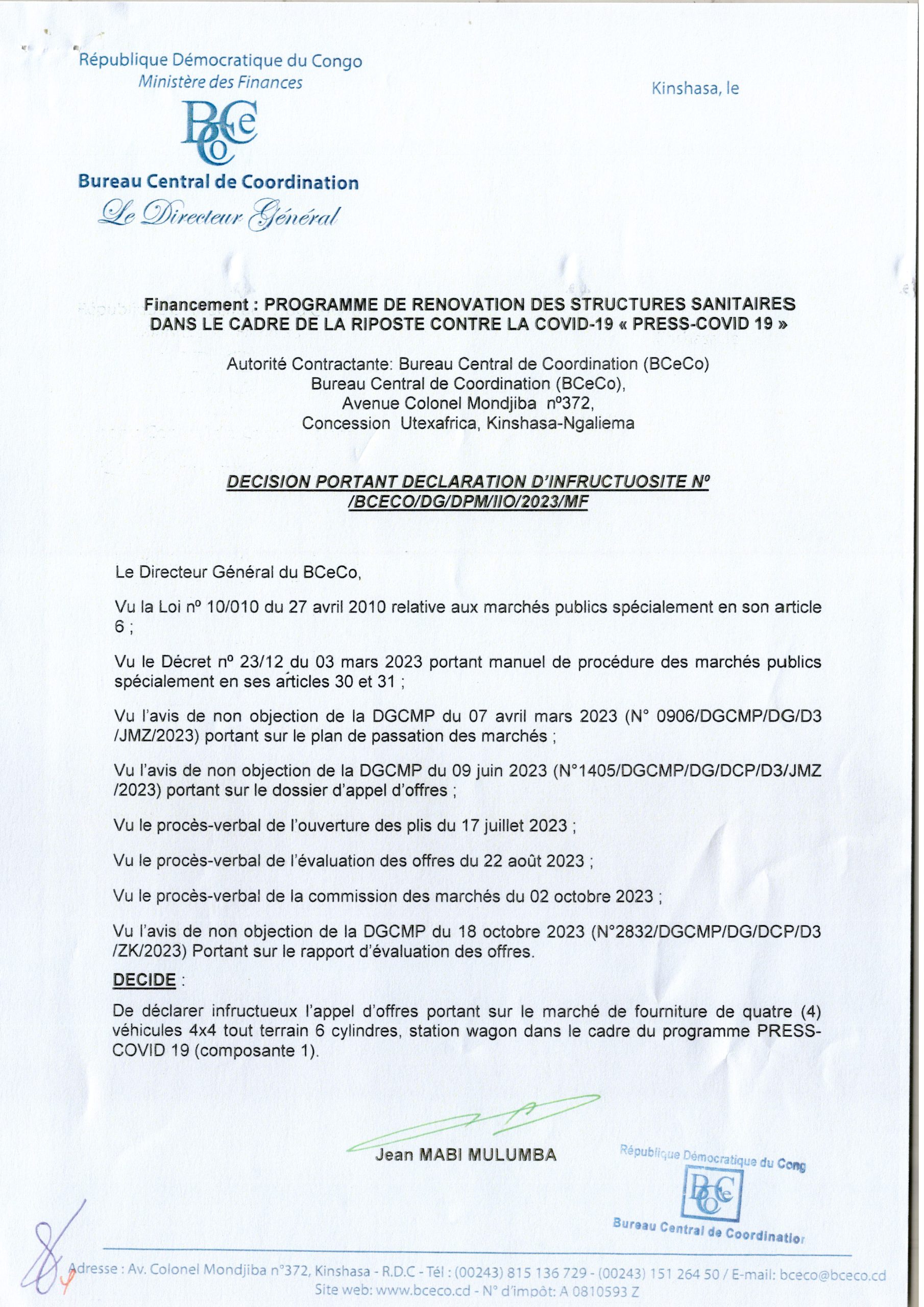 DÉCISION PORTANT DÉCLARATION D’INFRUCTUOSITÉ DE LA BCECO RELATIF À LA FOURNITURE DE QUATRE (4) VÉHICULES 4X4 TOUT TERRAIN 6 CYLINDRES, STATION WAGON DANS LE CADRE DU PROGRAMME PRESS-COVID 19 (COMPOSANTE 1)