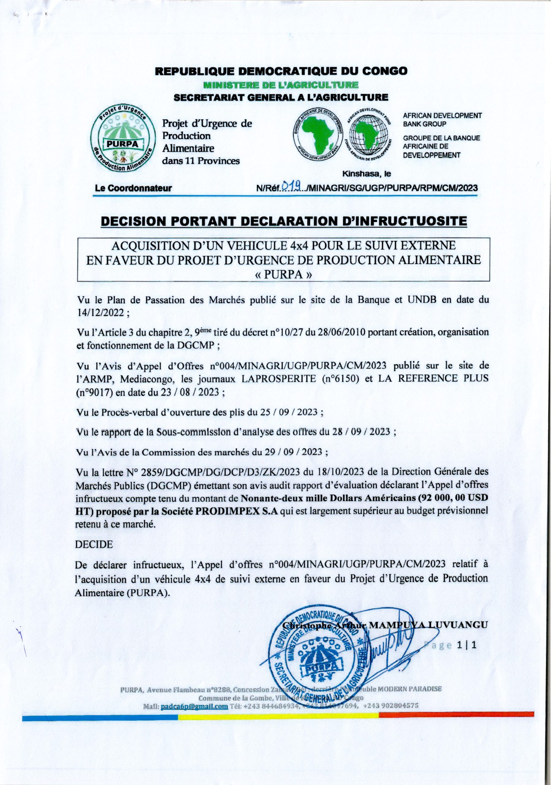 Décision portant déclaration d’Infructuosité du Ministère de l’Agriculture relatif à l’acquisition d’un Véhicule 4×4 pour le suivi externe en faveur du projet d’Urgence de production Alimentaire “PURPA”.