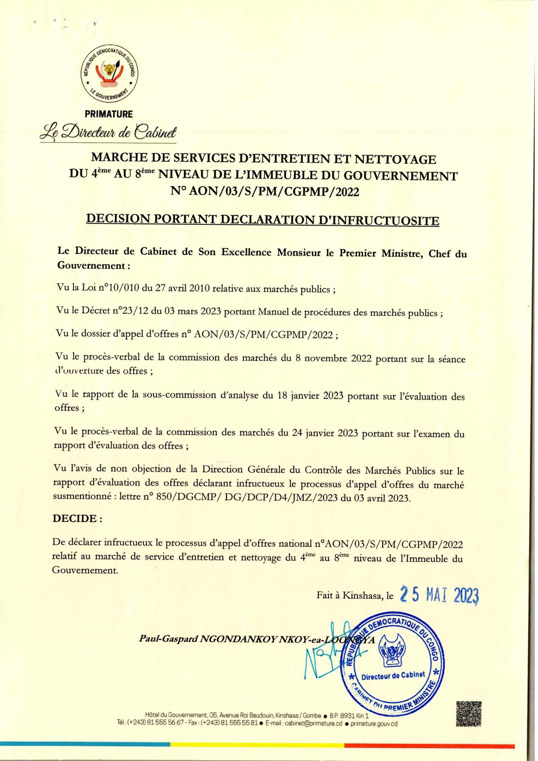 DECISION PORTANT DECLARATION D’INFRUCTUOSITE DE LA PRIMATURE RELATIF AU MARCHE DE SERVICES D’ENTRETIEN ET NETTOYAGE DU 4ème AU 8ème NIVEAU DE L’IMMEUBLE DU GOUVERNEMENT N°AON/03/S/PM/CGPMP/2022
