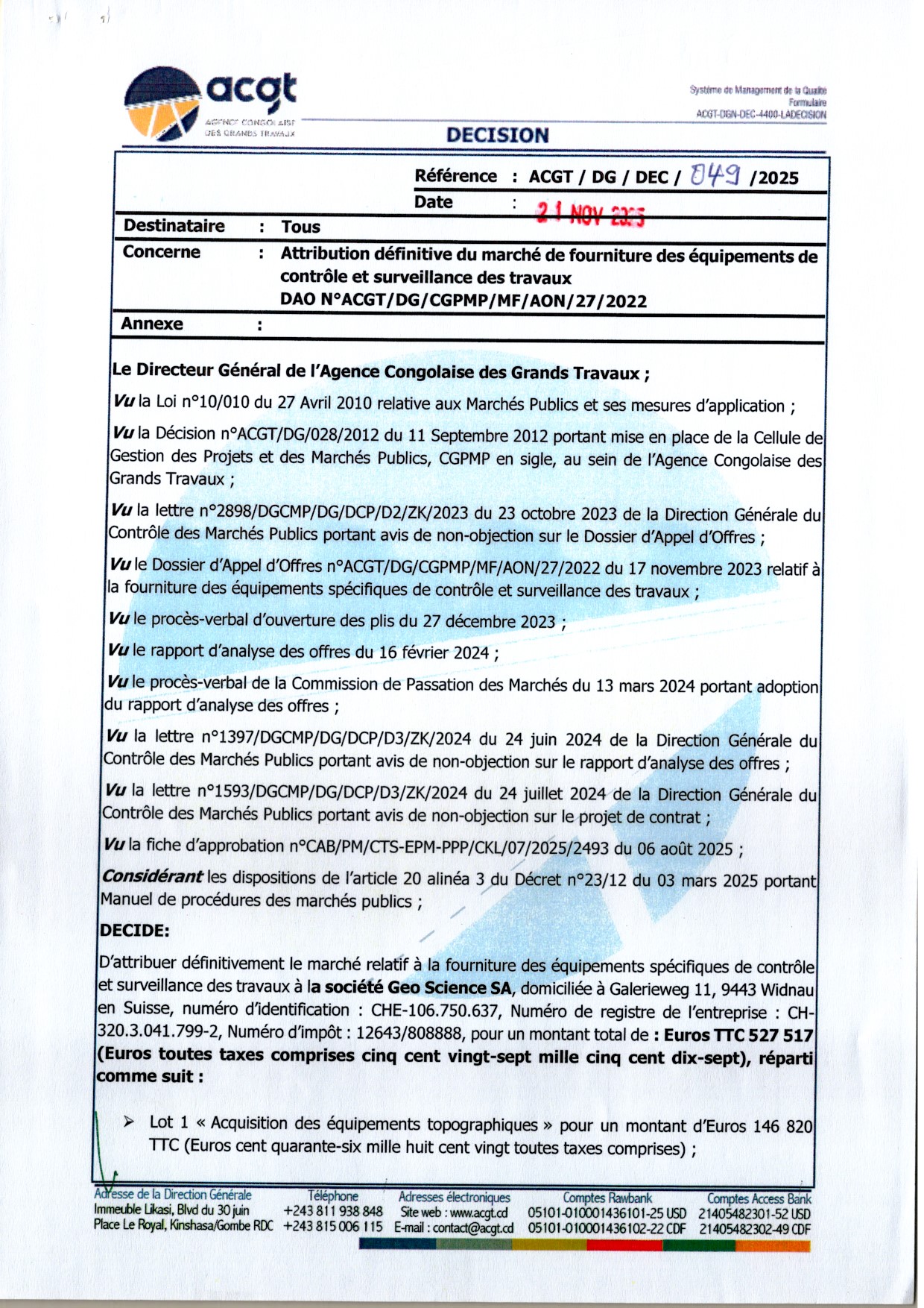 Attribution Définitive du marché de fourniture des équipements de contrôle et surveillance des Travaux à la société Geo Science SA
