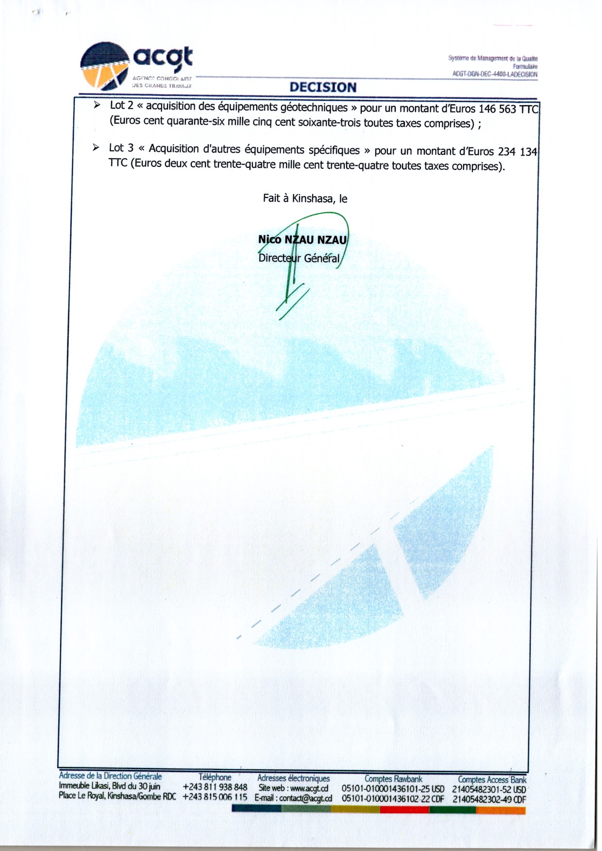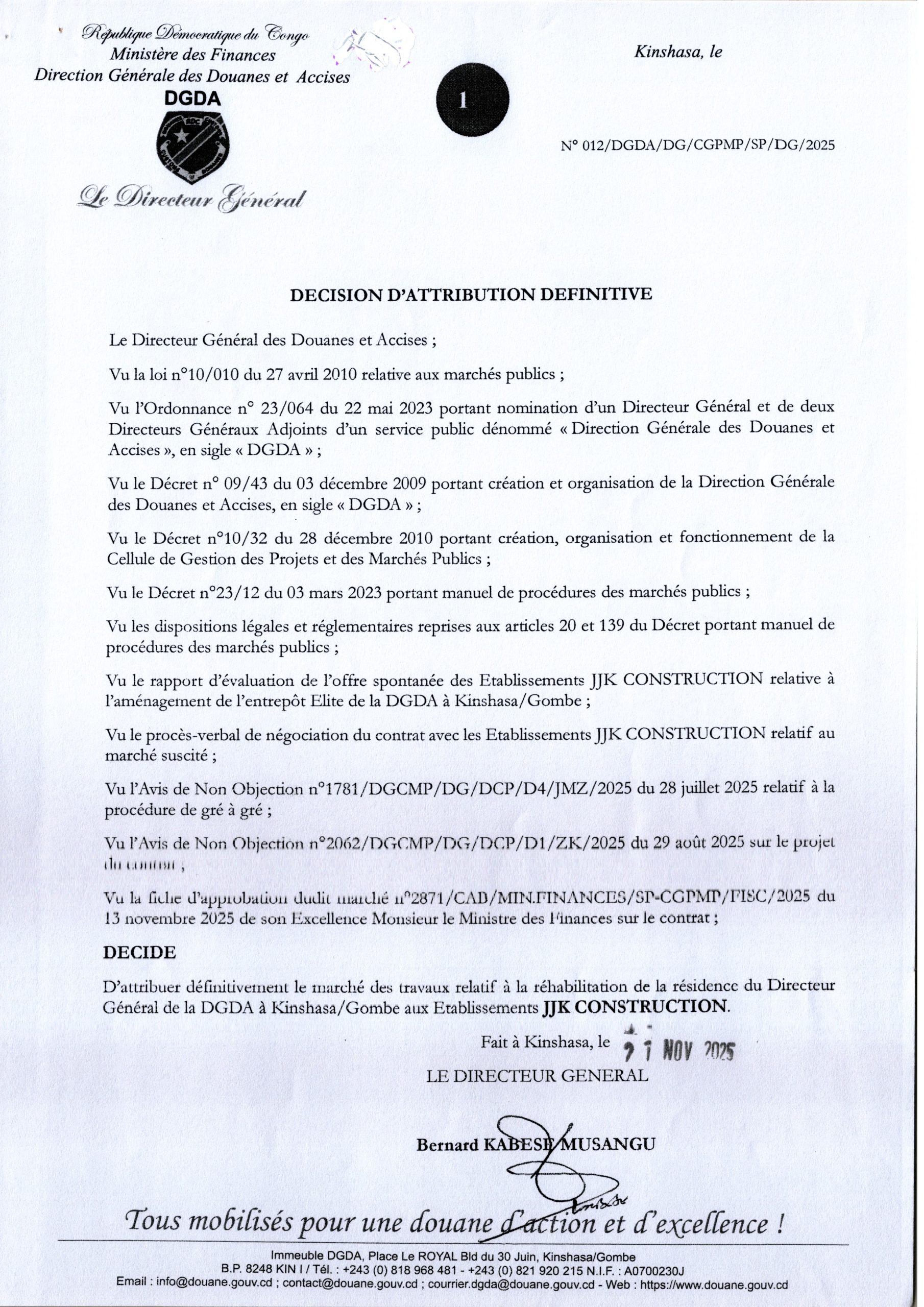 Attribution définitive accordée à la société “JJK CONSTRUCTION” le marché relatif aux travaux de réhabilitation de la résidence du Directeur Général de la DGDA à Kinshasa/Gombe.