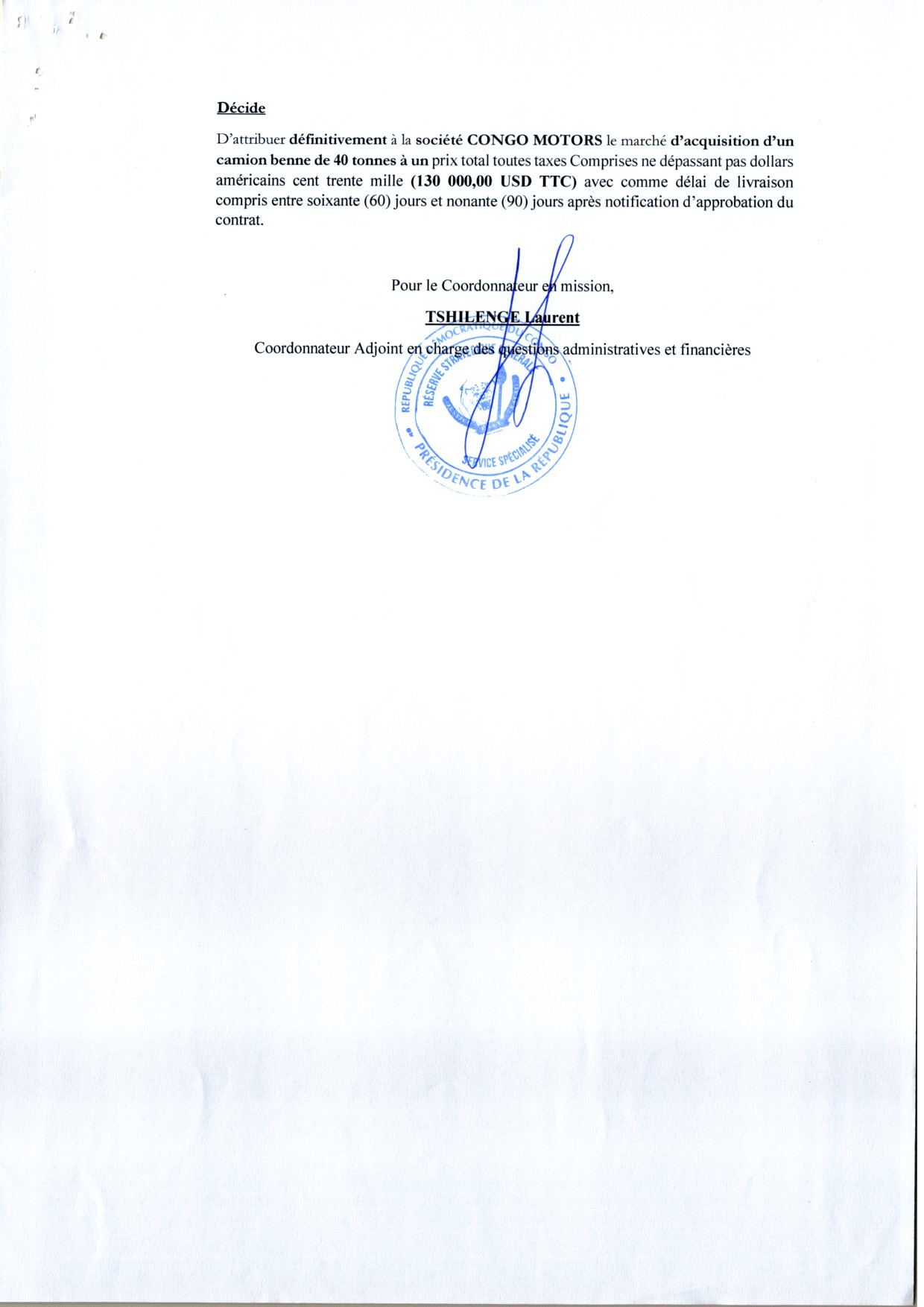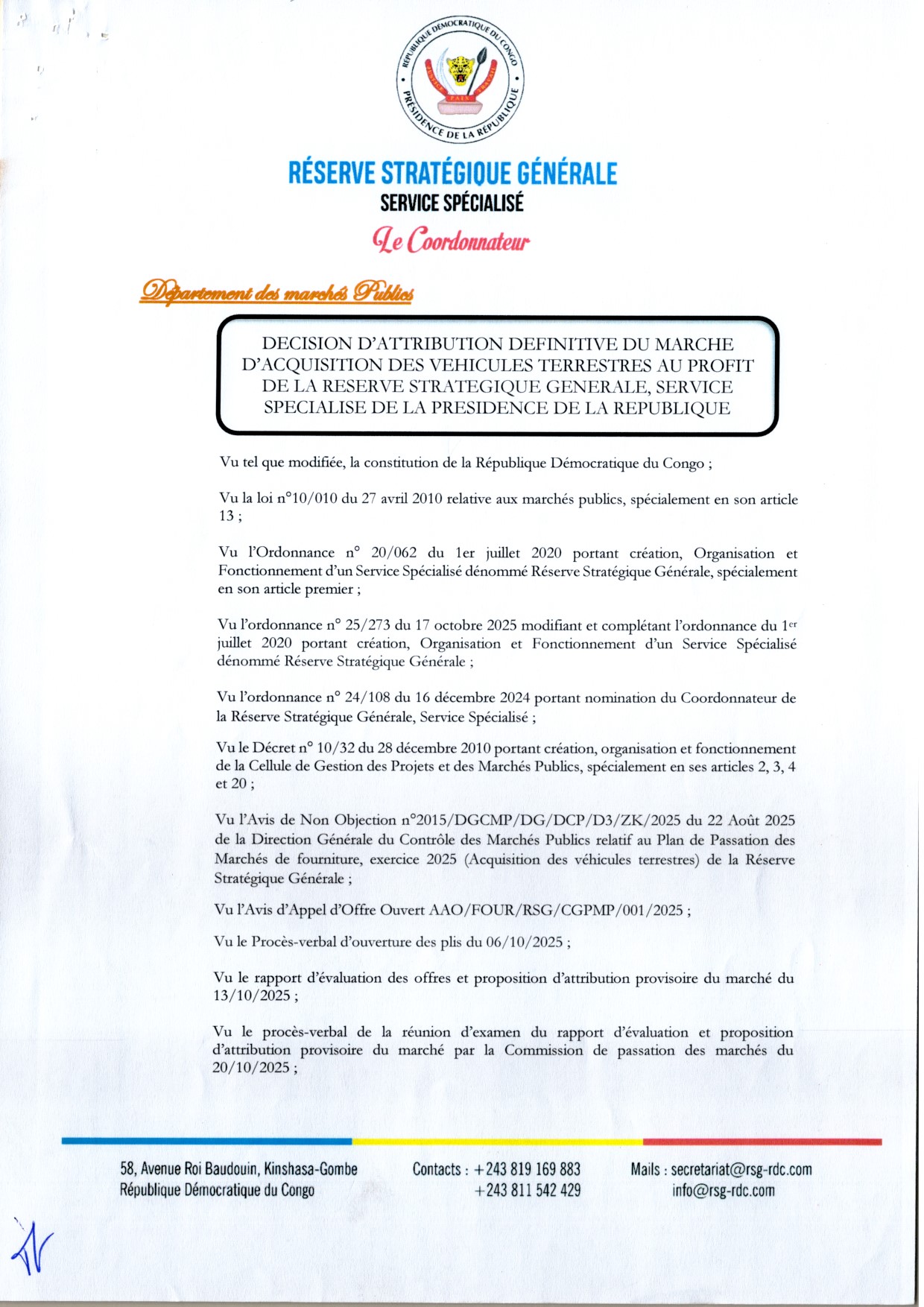 Attribution Définitive du marché d’acquisition des véhicules terrestres au profit de la Reserve Stratégique Générale, service Spécialise de la Présidence de la République à la société CONGO MOTORS
